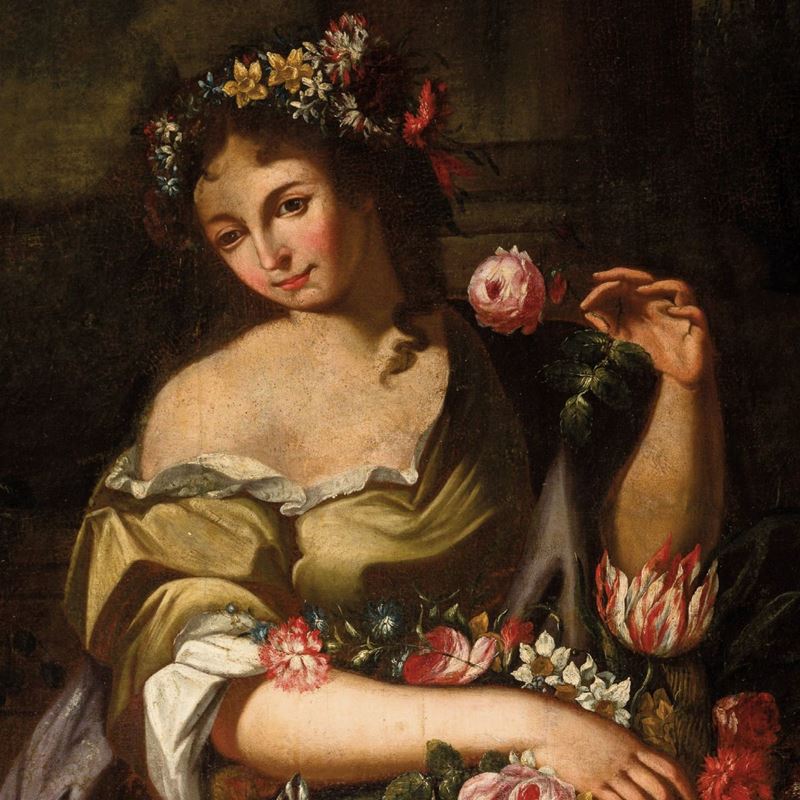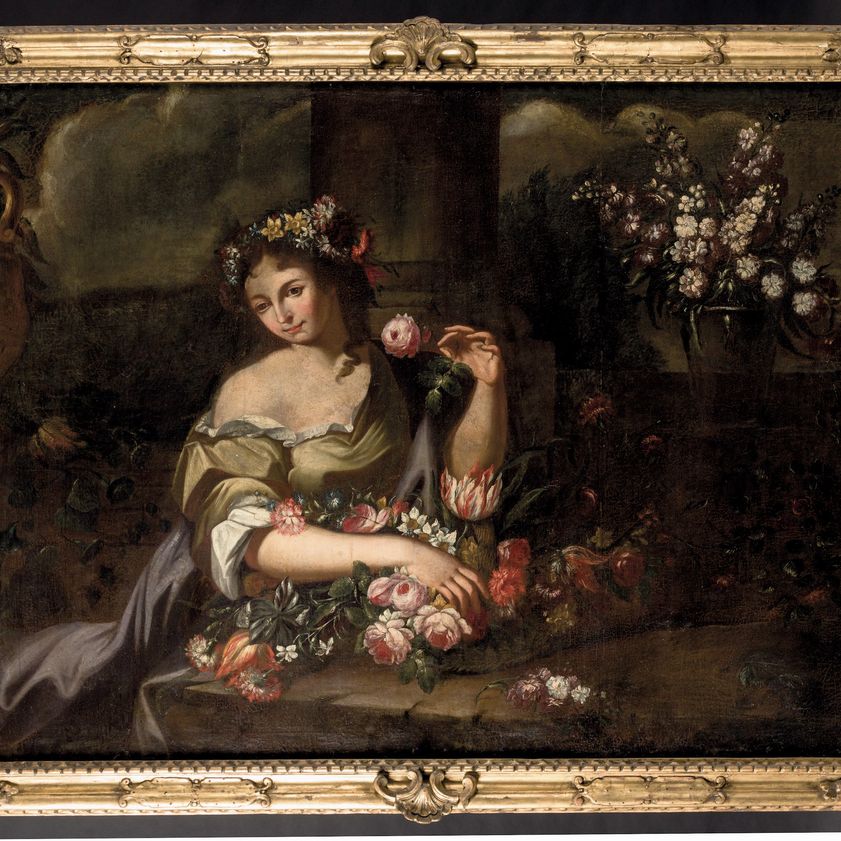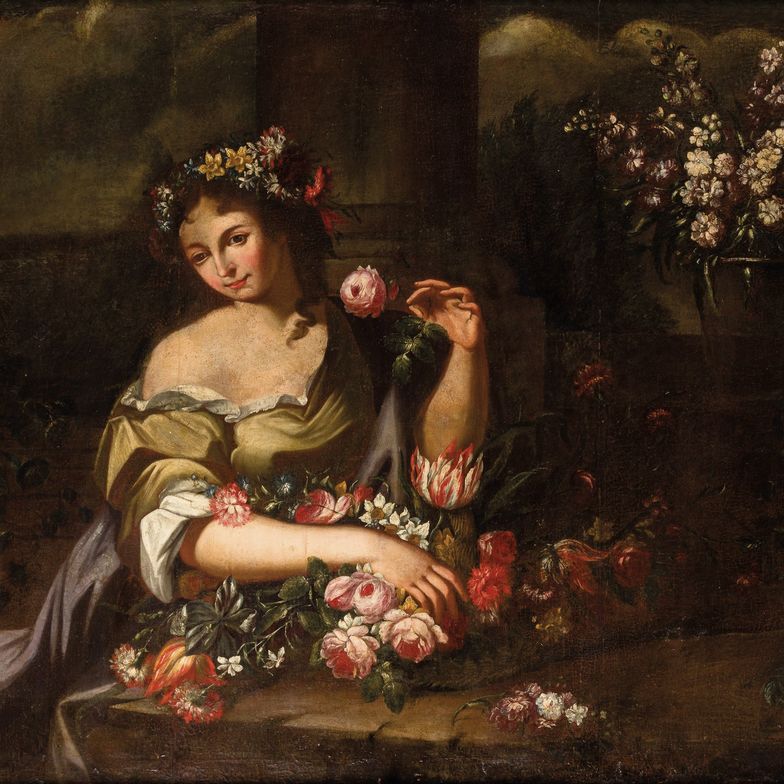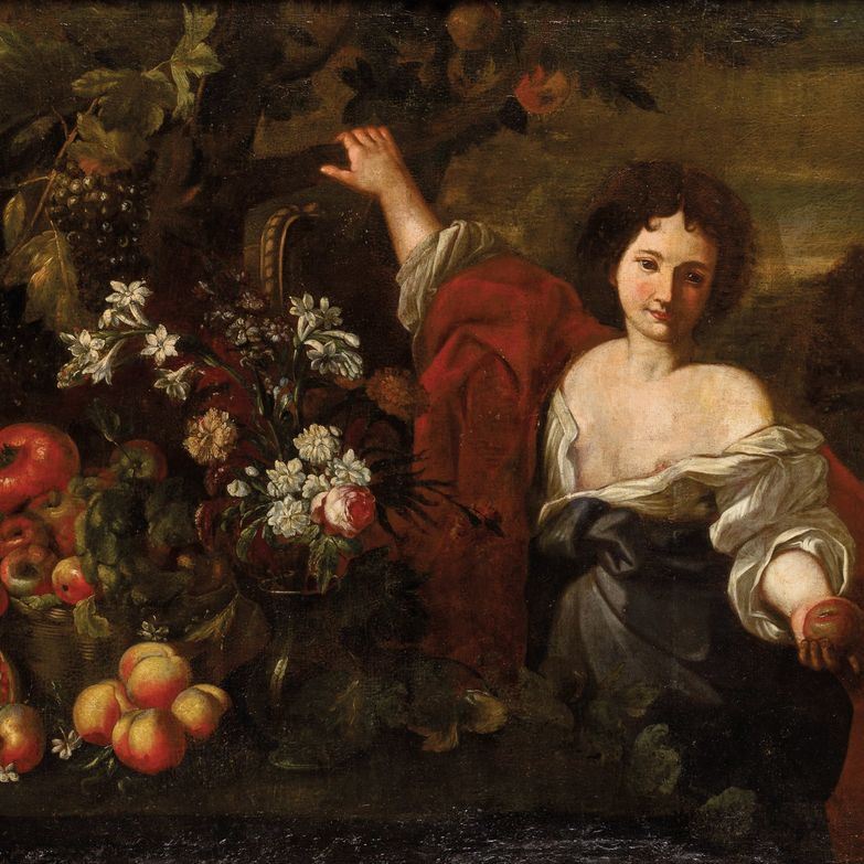Figure femminili con composizioni di fiori e frutti