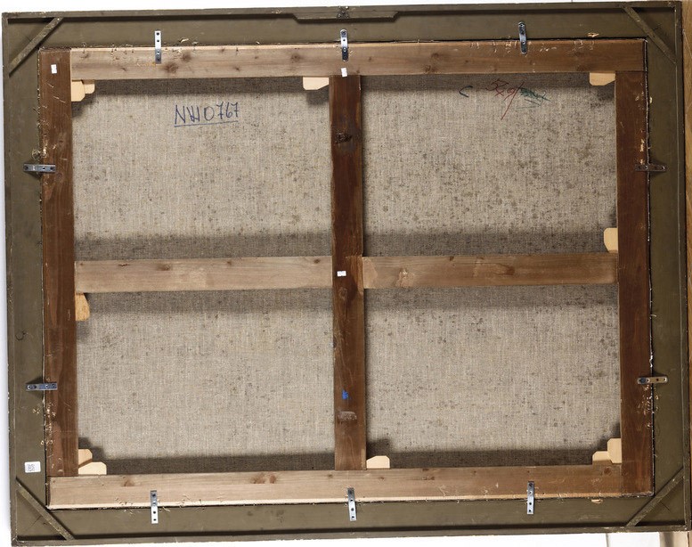 Interno di cucina con pesci, cacciagione e ceste di ortaggi