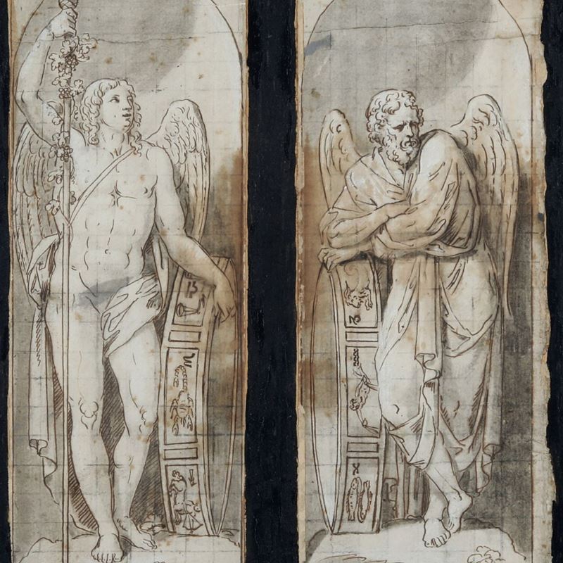 Fatte queste premesse iconografiche, va detto che i quattro disegni in esame, di fine gusto lineare neoclassico e perciò databili tra la fine del XVIII e i primi decenni del XIX secolo, possono essere stati creati come preparatori per delle incisioni destinate ad un'opera libraria poetico-celebrativa, oppure come parti di un progetto per la decorazione pittorica di un interno. Nacquero certamente in relazione ad una cultura molto diffusa tra Sette e Ottocento nelle classi più colte e benestanti, accogliendo l'antichissima convinzione che ogni attività umana sia inesorabilmente influenzata dall'astrologia, ‘antenata’ dell'astronomia, oltre ad esaltare temi rituali di operatività ermetica, alchemica e spagirica. Si tratta di simbologie molto complesse, composite e articolate ma ampiamente note e divulgate fino a prima della nascita della scienza moderna. (…)”