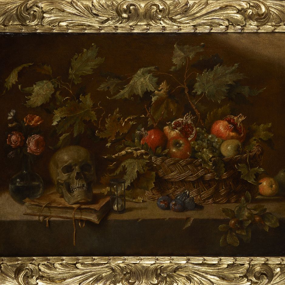 Maestro della natura morta Acquavella (attivo a Roma nella prima metà del XVII secolo) Natura morta con canestra di frutta e vanitas