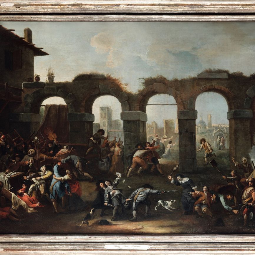 Davanti ad una casa, che si staglia a sinistra con il suo balcone in legno un po' fatiscente (ma che utilizza in parte la struttura portante di quello che sembra un antico acquedotto romano, che chiude la scena formando una sorta di ‘quinta’ teatrale) doveva esserci un convivio (si vede davanti una tavola imbandita, in fondo alcuni suonatori).,ma è successo qualcosa che ha scatenato una gigantesca rissa. Tutti contro tutti, con grande enfasi. ma senza sangue e con accenti anche umoristici. I suonatori brandiscono i loro preziosi strumenti come mazze ferrate (passi quello col violoncello ma un po' più in fondo quello col violino non credo possa fare del gran male....).