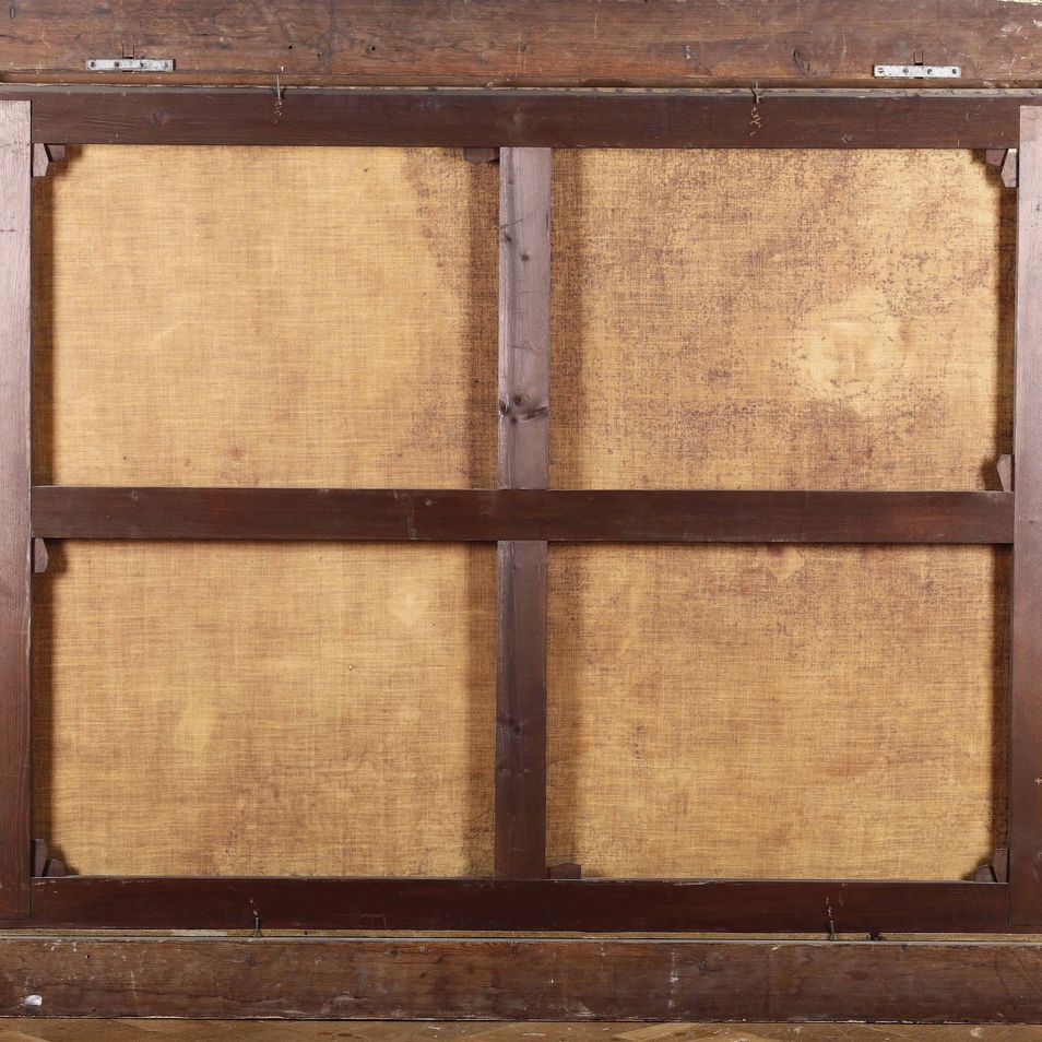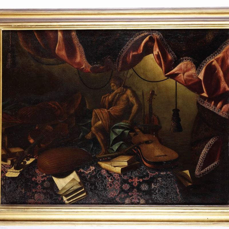 Scuola bergamasca del XVII secolo Natura morta con strumenti musicali, drappi e scultura di Nettuno