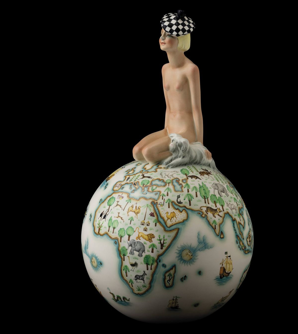 Scultura raffigurante nudino di donna con cagnetto e basco su mondo in terraglia a colaggio e decoro policromo. Marchio della manifattura e data sulla base.