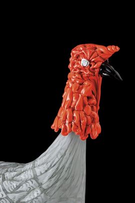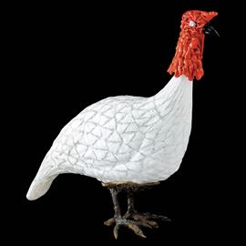 Scultura raffigurante tacchino con zampe in bronzo fuso a cera persa, corpo in vetro soffiato con decoro di murrine lattimo e cristallo. Testa in vetro corallo.