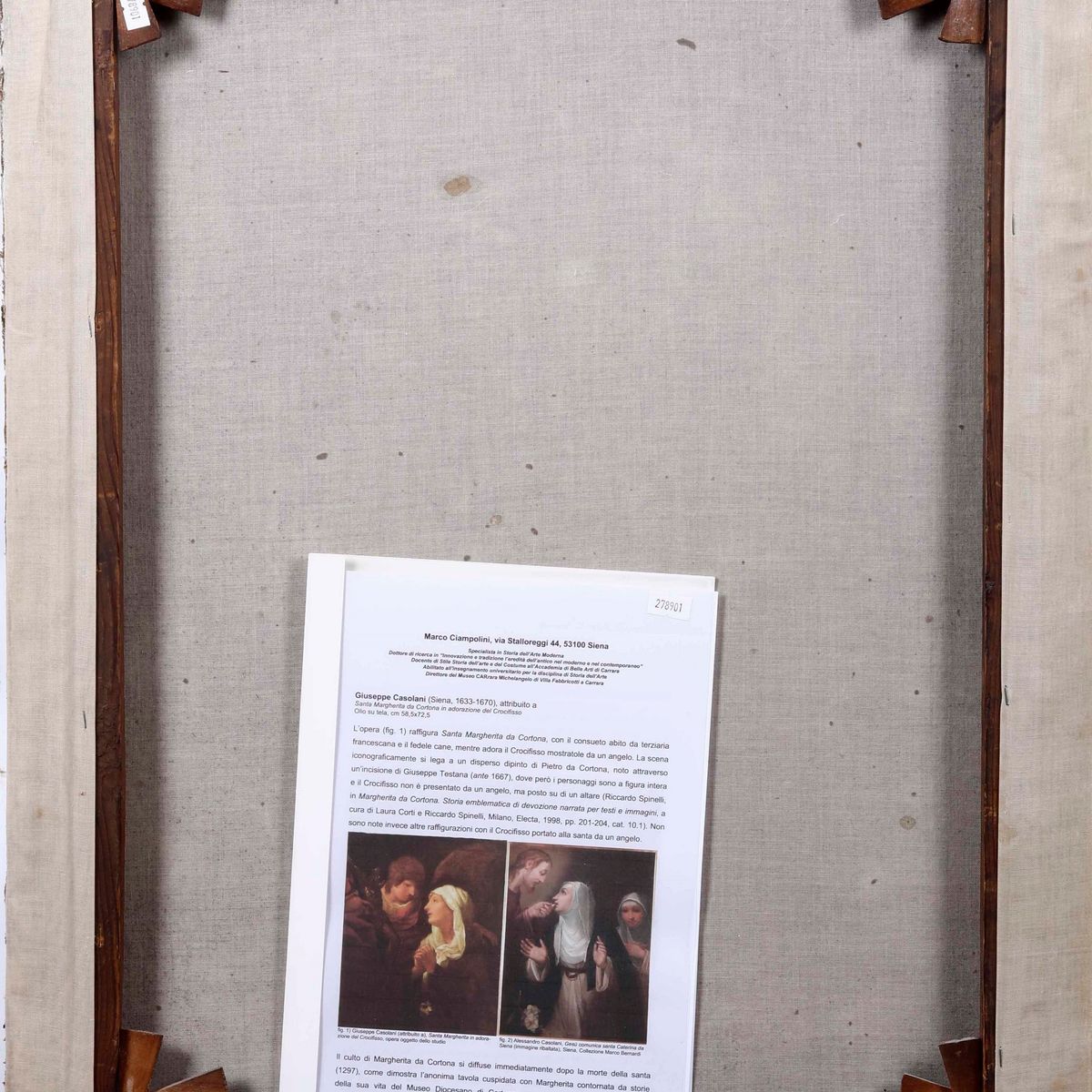 "L'opera raffigura Santa Margherita da Cortona, con il consueto abito da terziaria francescana e il fedele cane, mentre adora il Crocifisso mostratole da un angelo. La scena iconograficamente si lega a un disperso dipinto di Pietro da Cortona, noto attraverso un'incisione di Giuseppe Testana (ante 1667), dove però i personaggi sono a figura intera e il Crocifisso non è presentato da un angelo, ma posto su di un altare (Riccardo Spinelli, in Margherita da Cortona. Storia emblematica di devozione narrata per testi e immagini, a cura di Laura Corti e Riccardo Spinelli, Milano, Electa, 1998, pp. 201-204, cat. 10.1). Non sono note invece altre raffigurazioni con il Crocifisso portato alla santa da un angelo. Il culto di Margherita da Cortona si diffuse immediatamente dopo la morte della santa (1297), come dimostra l'anonima tavola cuspidata con Margherita contornata da storie della sua vita del Museo Diocesano di Cortona, ma ebbe un'impennata dopo che Innocenzo X Pamphili (17 marzo 1653) ne approvò il culto. Un atto che conseguentemente provocò un fermento iconografico a cui appartiene anche l'opera in oggetto. Osserviamo, infatti, che l'opera è condotta con una materia pastosa e pittorica, tipica della pittura neoveneta degli anni Cinquanta e Sessanta del Seicento. Ciononostante la composizione, con la languida Santa in profilo tagliente assistita da un soavissimo angelo, porta il ricordo di modelli più antichi, segnatamente della tradizione di primo Seicento, in particolare della scuola senese. (...)"
