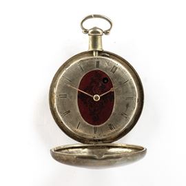 Orologio da tasca demi-hunter George Penberton London, inglese del 1820 circa con movimento con scappamento verga, quadrante in argento (posteriore)