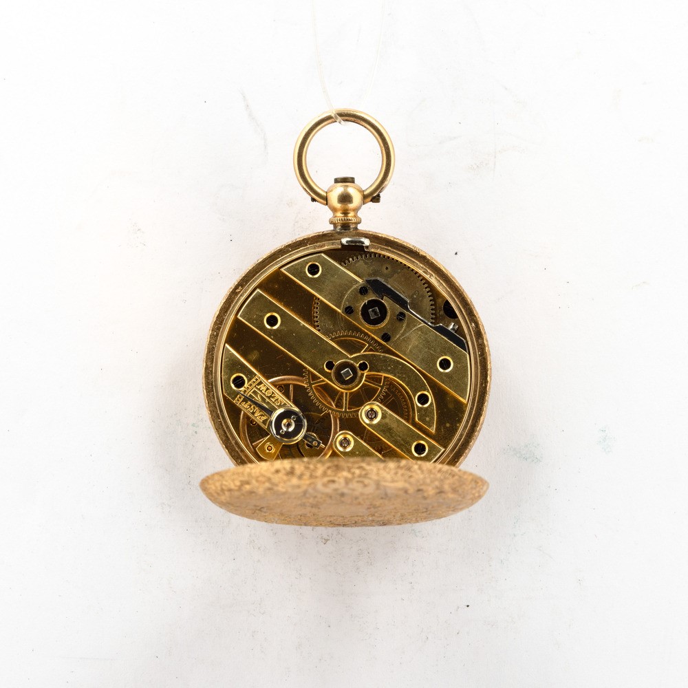 Orologio da collo da donna, 1870 circa, cassa in oro 18 kt, quadrante in oro, movimento con scappamento a cilindro.