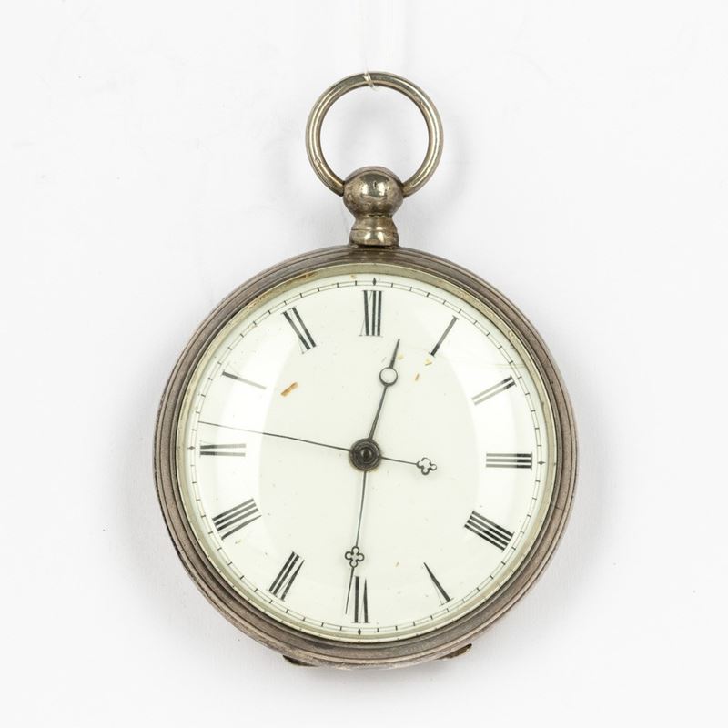 Orologio da tasca del 1800 circa creato con il movimento di orologio inglese per il mercato cinese, scappamento duplex, ospitato in cassa in argento posteriore, quadrante in smalto bianco con lancette con secondi centrali