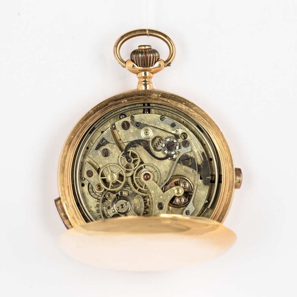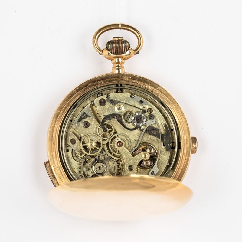 Orologio da tasca del 1910 circa in oro 18 kt con cassa a tre corpi, ripetizione ore-quarti e chrono, movimento con scappamento ad ancora, ripetizione azionata con pulsante, quadrante in smalto bianco