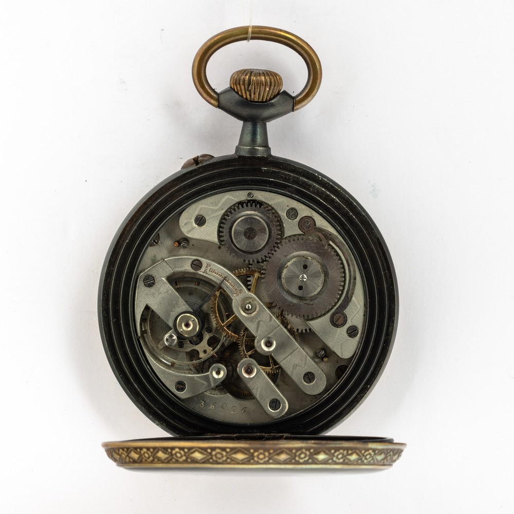 Orologio da tasca Regulator francese del 1890 circa con cassa in acciaio brunito, quadrante in smalto con cartuche e dotato di cassa di protezione