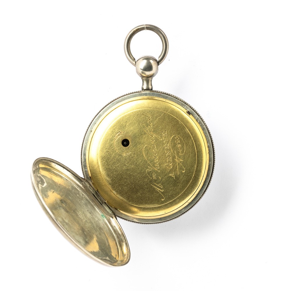 Orologio da tasca "Vacheron Giraud a Geneve" del secondo quarto del XIX secolo con suoneria ore e quarti su gong, cassa in argento, movimento con scappamento verga e quadrante in smalto bianco.
