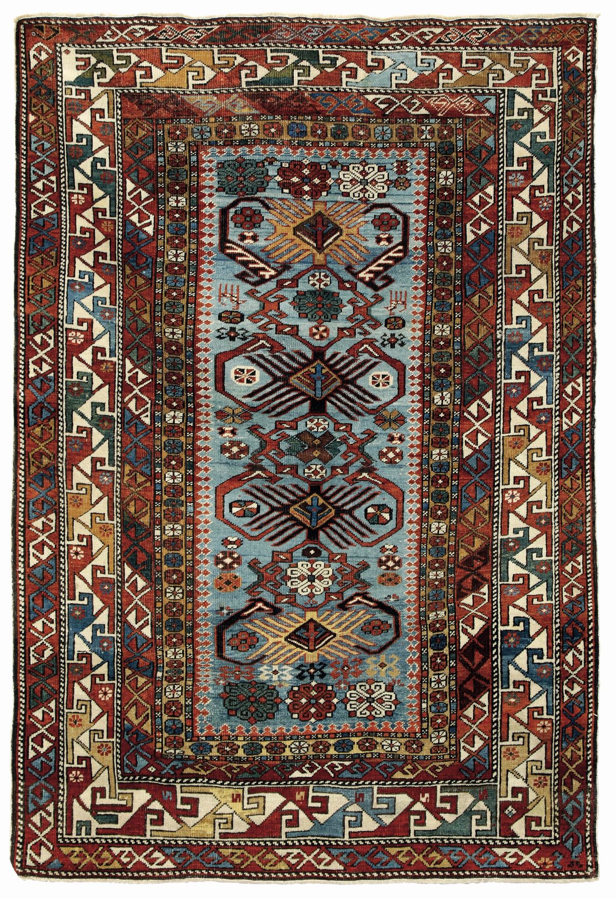 raro il campo azzurro con motivi arcaici ripetuti variando dimensioni e colori. Bordura bianca con triangoli uncinati
