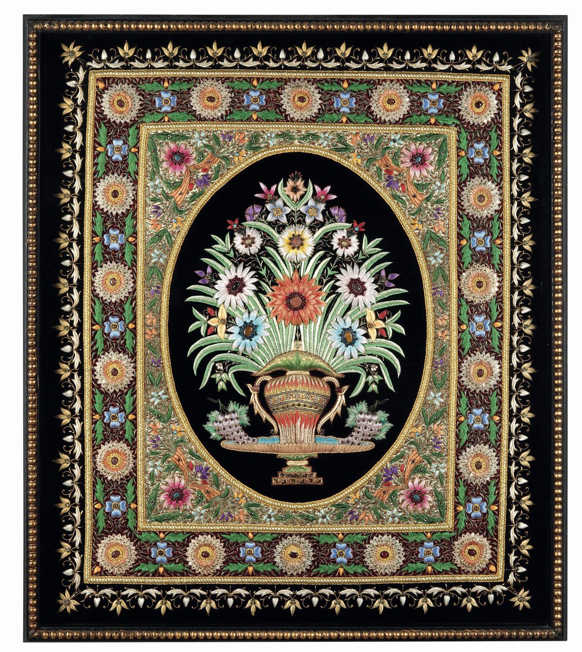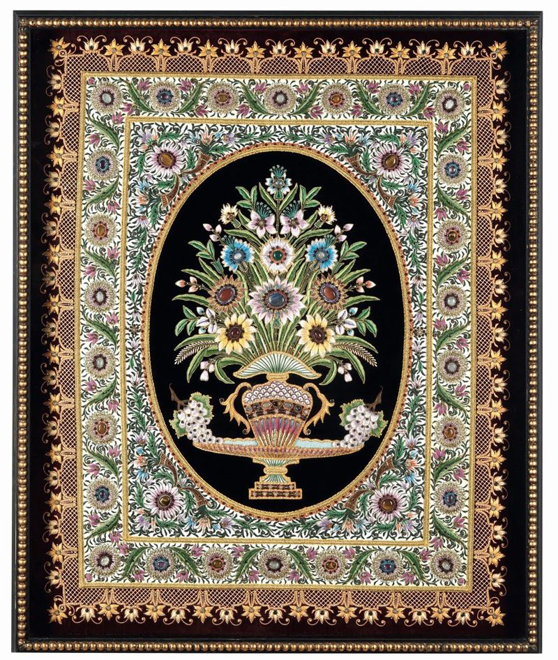 Tre prestigiosi e rari pannelli a ricamo su seta con fili d'oro e pietre dure. Inizio XX secolo