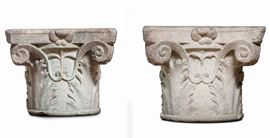 Due capitelli compositi. Lapicida rinascimentale, Italia XV-XVI secolo
