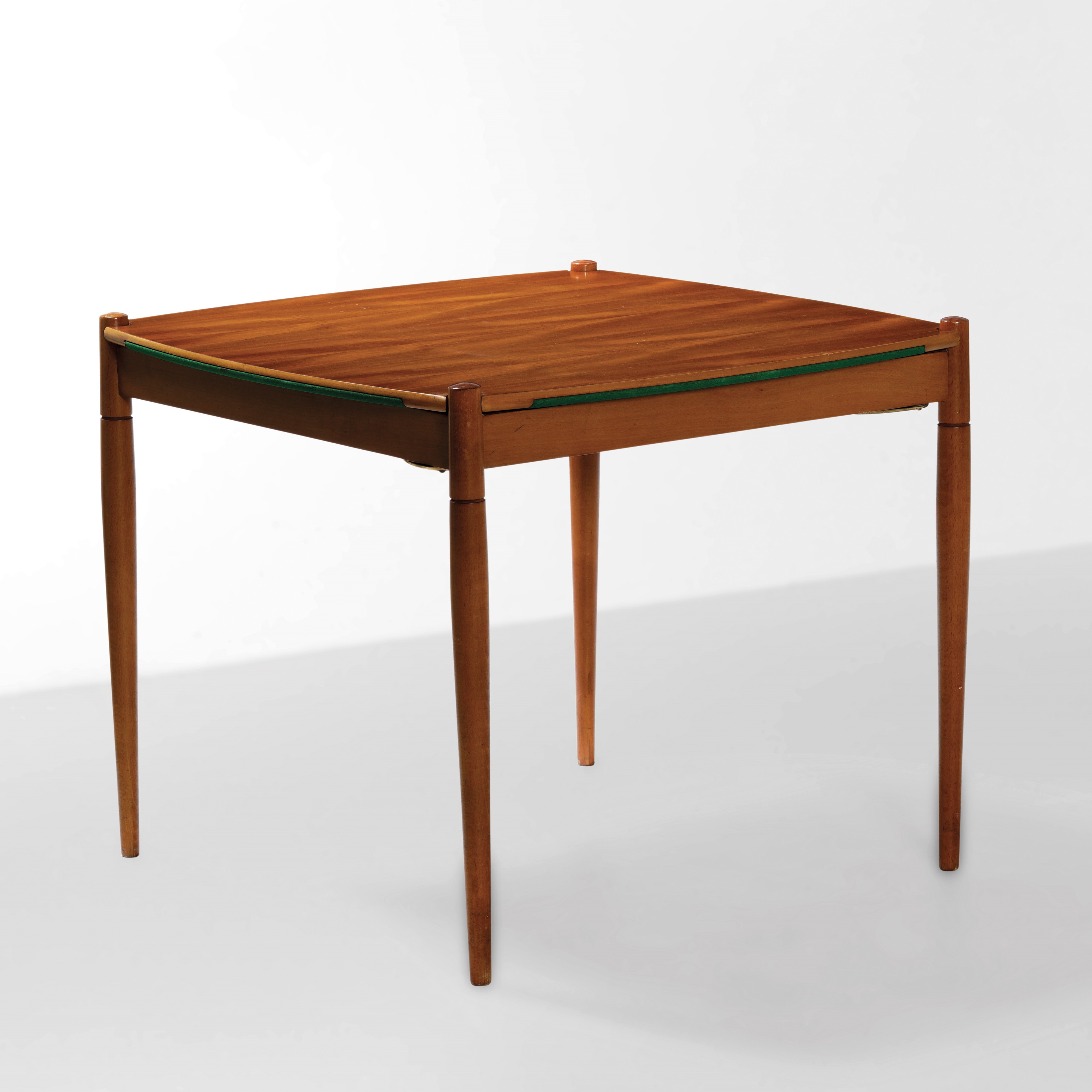 Struttura in legno, piano con rivestimento in panno e posaceneri estraibili in ottone.