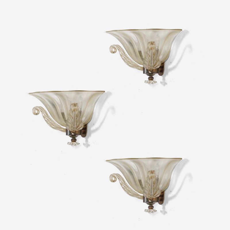 Struttura in ottone e diffusori in vetro di Murano con inclusioni in oro.