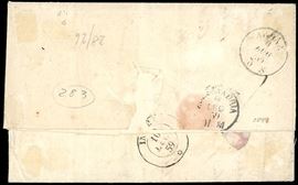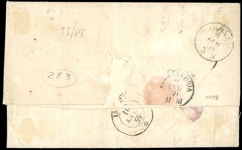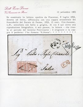 Lettera da Piacenza per Intra dell’8 luglio 1859, affrancata in tariffa ducale di 30 cents. per i Paesi italiani, valida fino al 31 luglio, con coppia del 15 cents. III emissione (S. 9). A lato, bollo “PD” in cartella in rosso, al verso bollo di transito di Alessandria e di Arona del 9 e di arrivo a Intra del 10 luglio. Molto bella e rara. Cert. E. Diena.