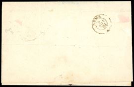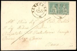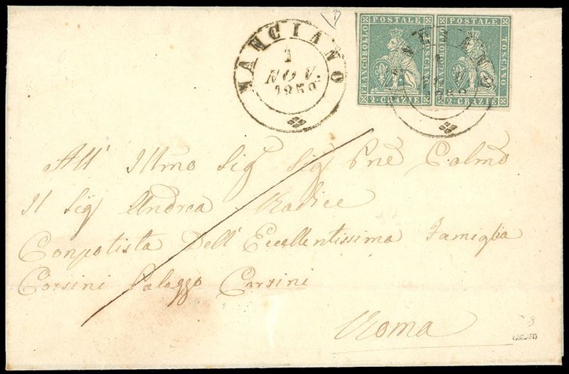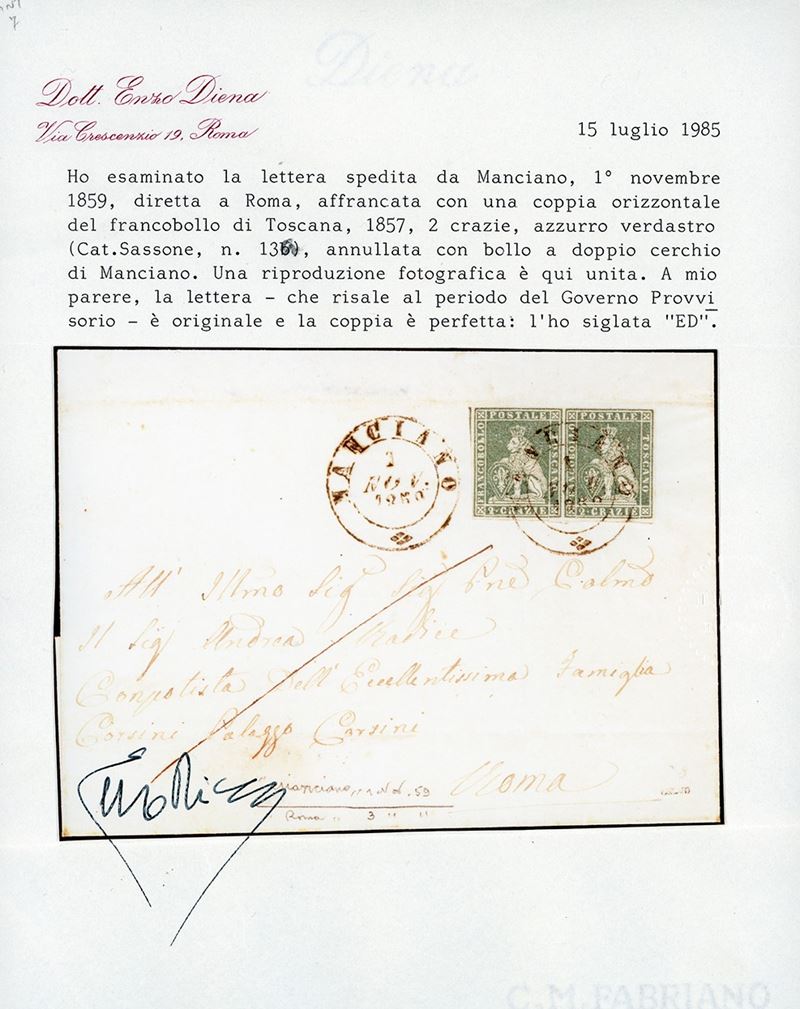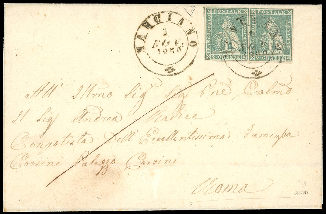 affrancata in tariffa di 4 crazie per lettere via di terra per la seconda distanza, dirette nello Stato Pontificio, con coppia del 2 crazie verde su bianco (S, 13a), annullata con bollo a doppio cerchio di Manciano. Al verso bollo di arrivo di Roma del 3 novembre. Molto bella, coppia perfetta, ben marginata. Raro uso in G.P. Cert.E.Diena.