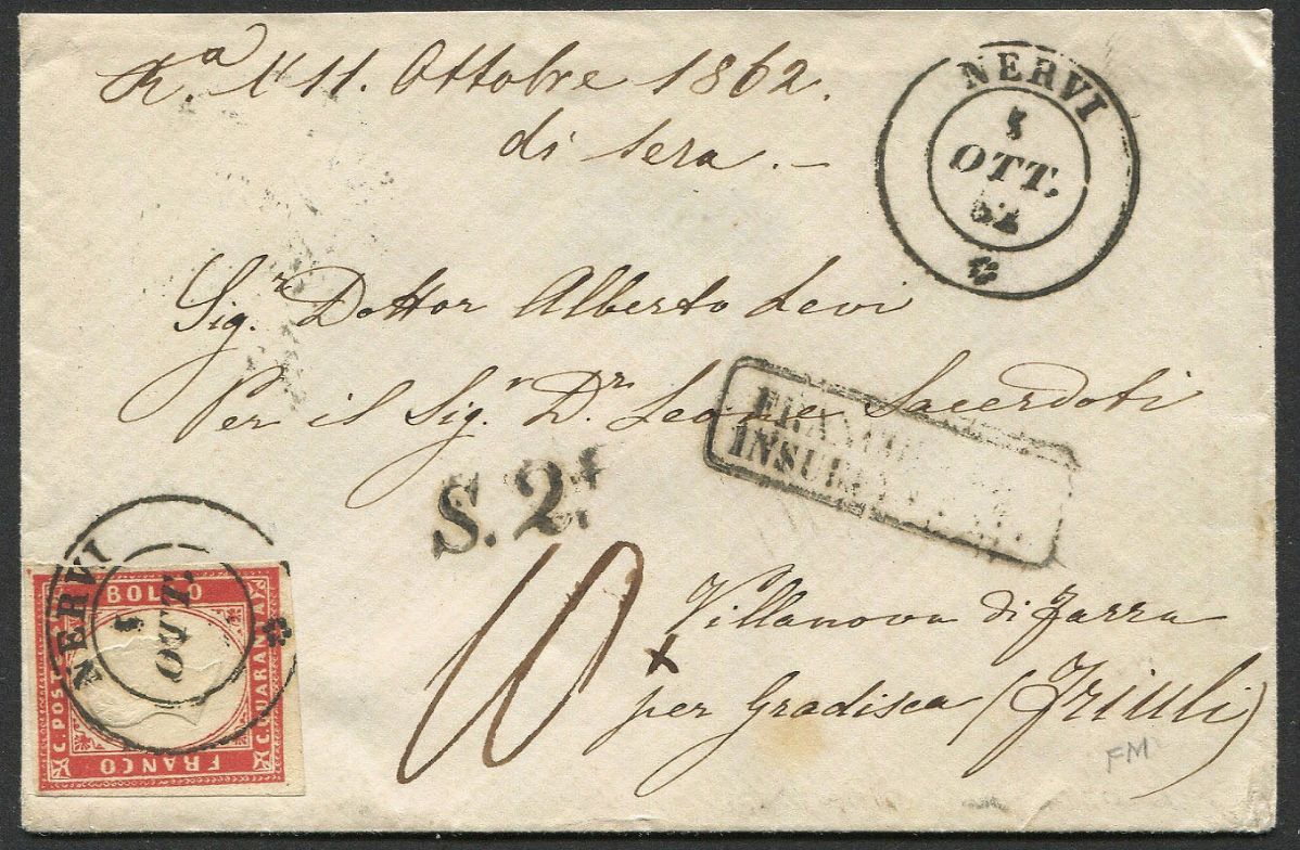1862, Regno d’Italia, lettera da Nervi per Gradisca (Friuli) del 5 ottobre 1862