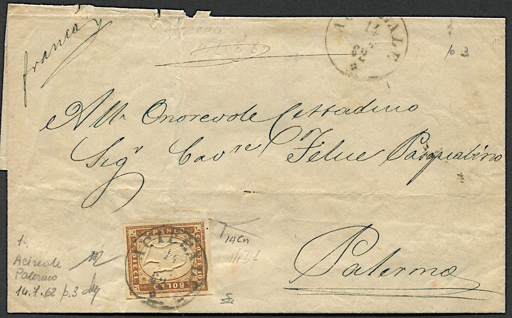 1862, Regno d’Italia, Sardegna, lettera da Acireale per Palermo del 14 luglio 1862