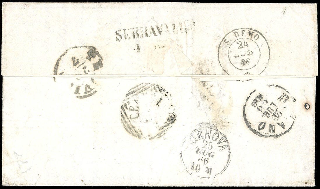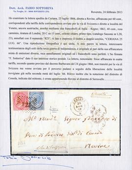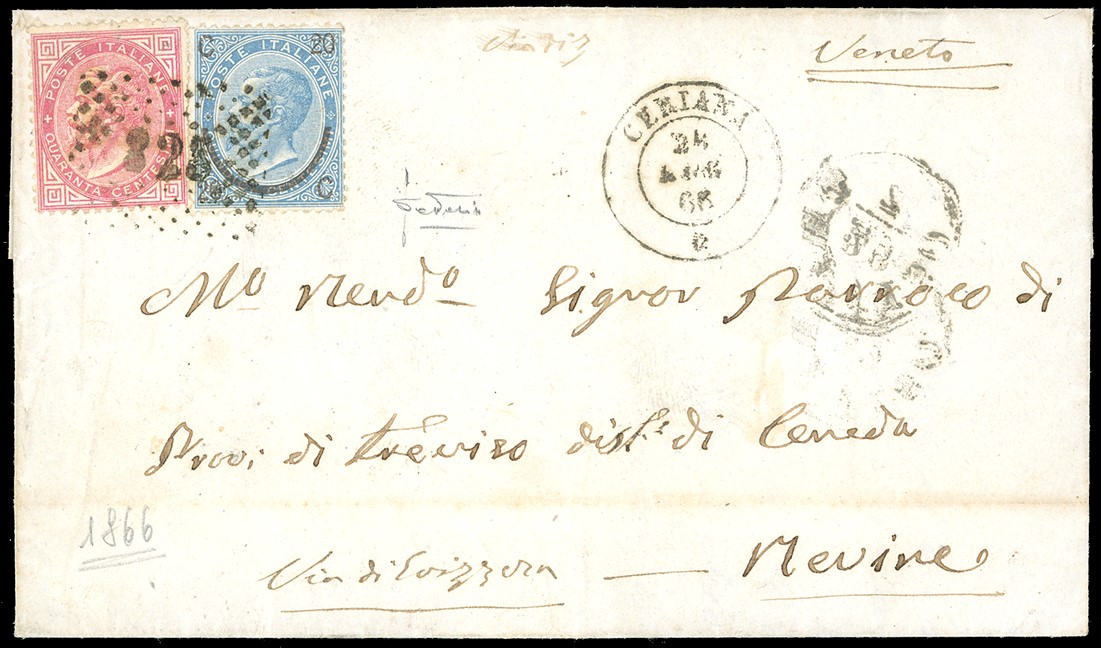 affrancata per 60 centesimi con 20 centesimi I tipo e 40 centesimi, a formare la tariffa per le corrispondenze avviate per la Via di Svizzera, secondo le intenzioni dell’addetto al servizio di spedizione di Ceriana. La lettera però fu avviata per le normali vie padane a seguito della liberazione delle località trevigiane già nella seconda metà del luglio 1866. Al verso bolli di transito di San Remo del 24, Genova 25, Milano 25, Treviso 29, Ceneda e Serravalle dove giunse il 4 agosto. Bella lettera diretta a località liberate, indicazione manoscritta “Via di Svizzera” in basso.