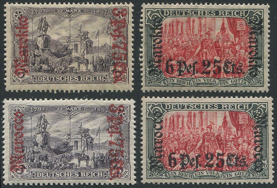 2 serie di 13 valori: sovrastampati “Marocco” e nuovo valore (Yv. 20/32), il valore da 1p. 25 cents. (Yv. 29) sostituito dallo stesso valore ma con filigrana a losanga (Yv. 42). Inoltre, altra serie con sovrastampa “Marokko” e nuovo valore (Yv. 42/57). Tutti gli esemplari nuovi con t.l. pesante, ma di eccellente aspetto. Insieme non comune.