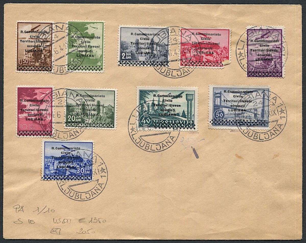 1941, Lubiana, Posta Aerea, busta non viaggiata affrancata con la prima serie di P. Aerea