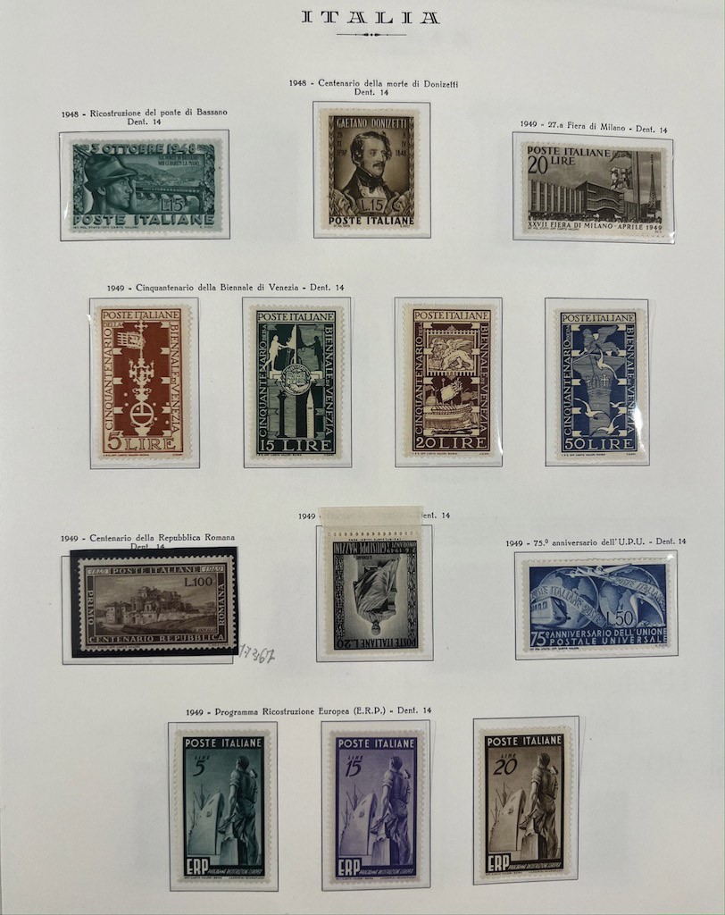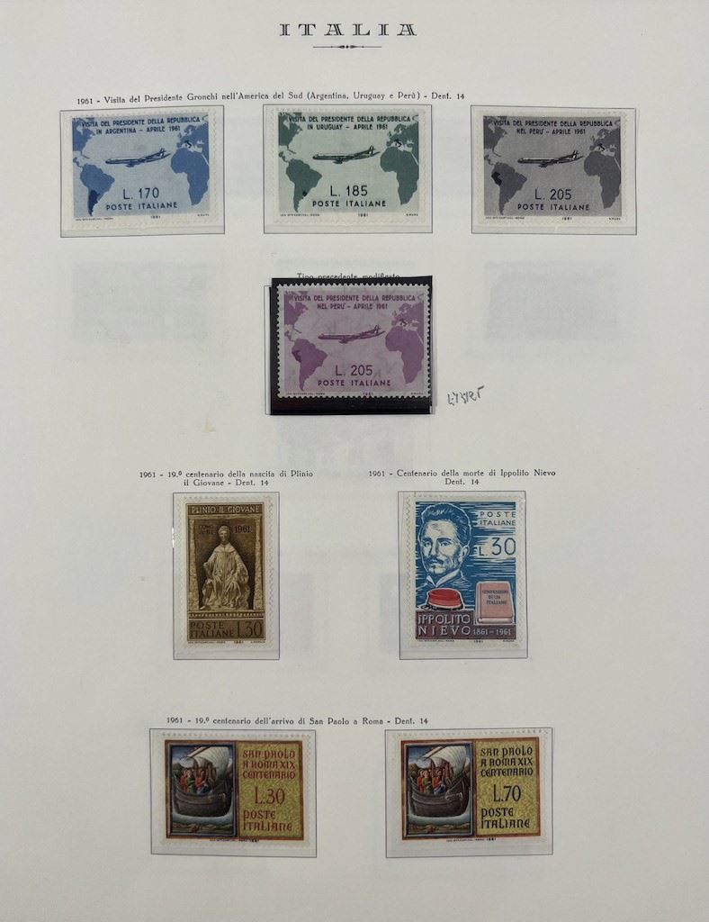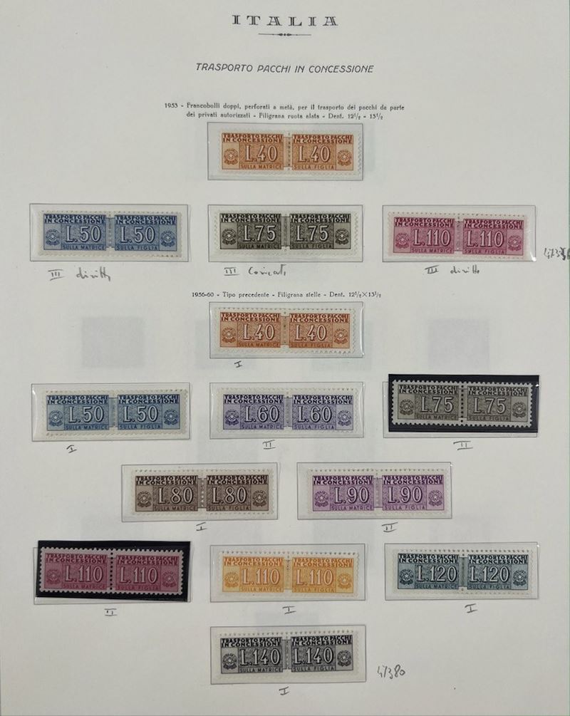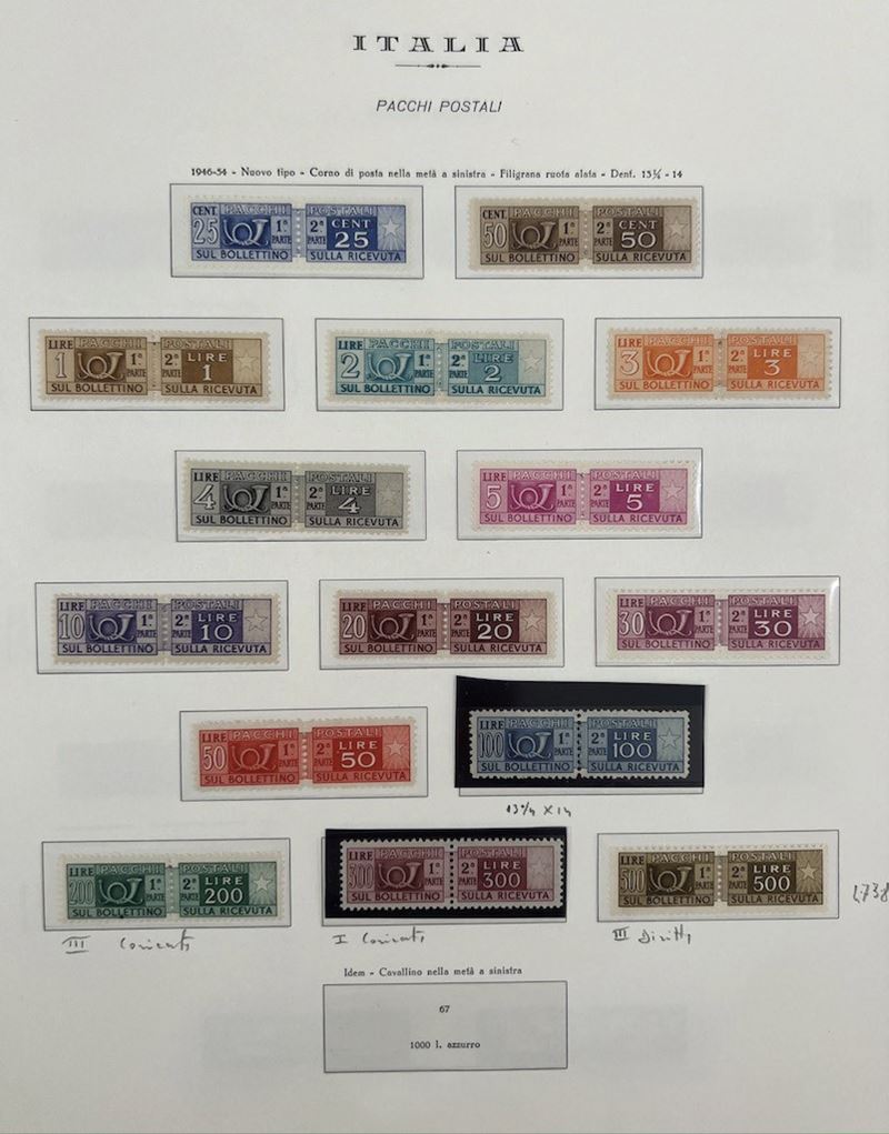 escluso il lire 1000 pacchi postali fil. “ruota” (”Cavallino”). Tutti i francobolli con gomma integra, perfetti, compresi i servizi, il “Gronchi rosa”, i pacchi postali, in concessione, e segnatasse, in un album “Marini”, merita attenta visione.