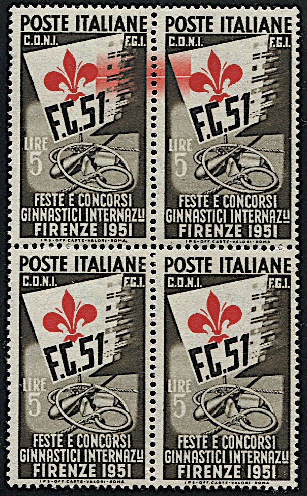 1951, Repubblica Italiana, “Ginnici” lire 5 in blocco di quattro