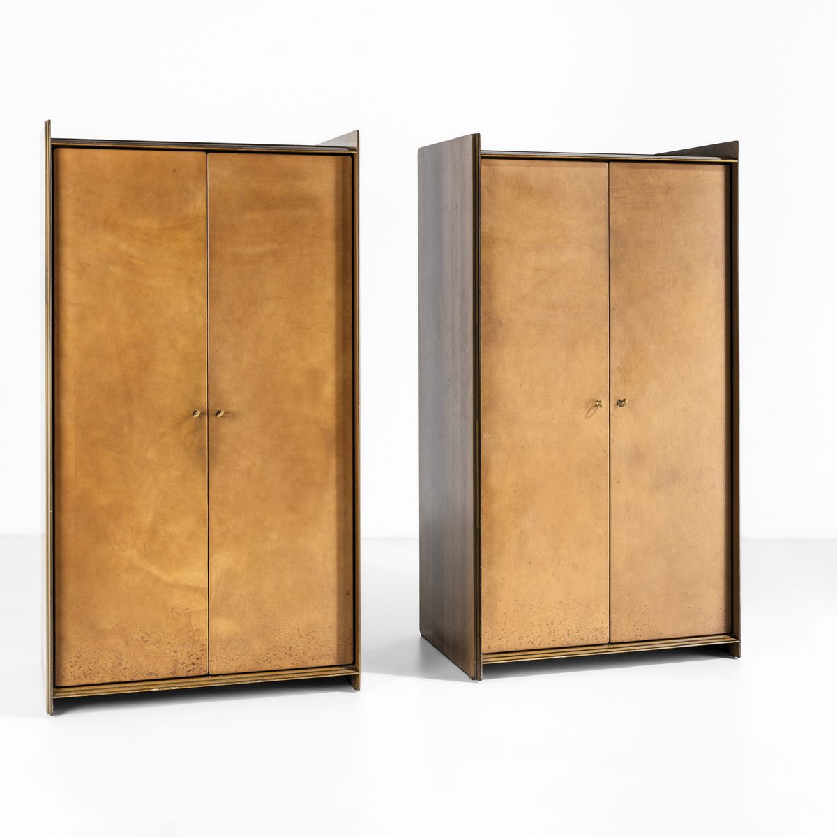 Struttura in legno in diverse essenze. Rivestimenti in pelle. Maniglie in cuoio.
