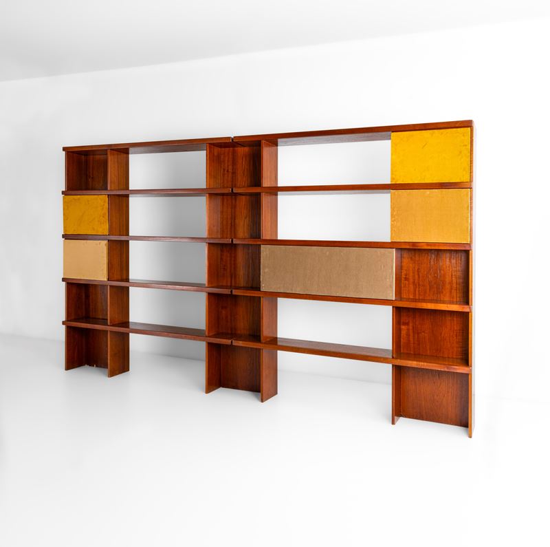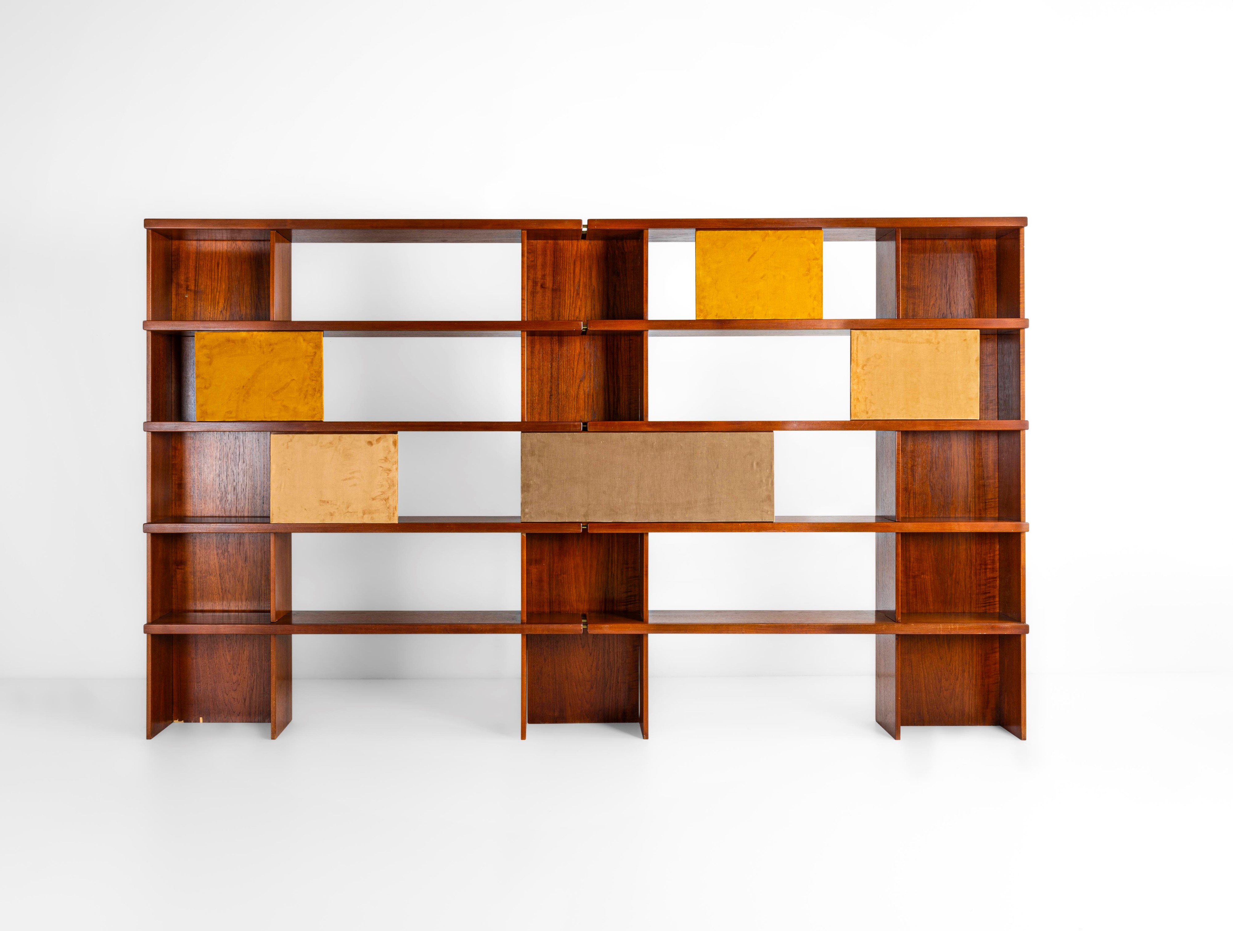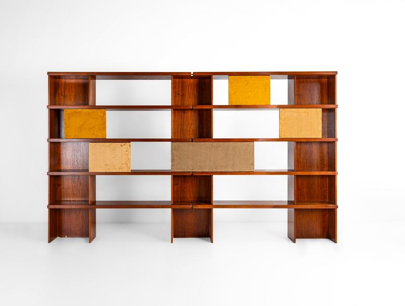 Struttura in legno e legno impiallacciato, ante scorrevoli in legno rivestite in velluto.