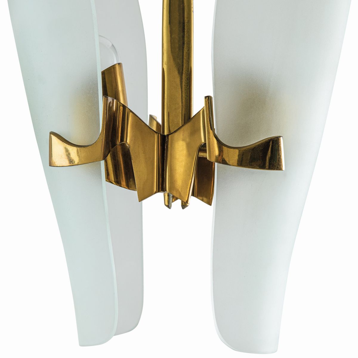 Struttura in ottone e diffusori in cristallo curvato molato e satinato.