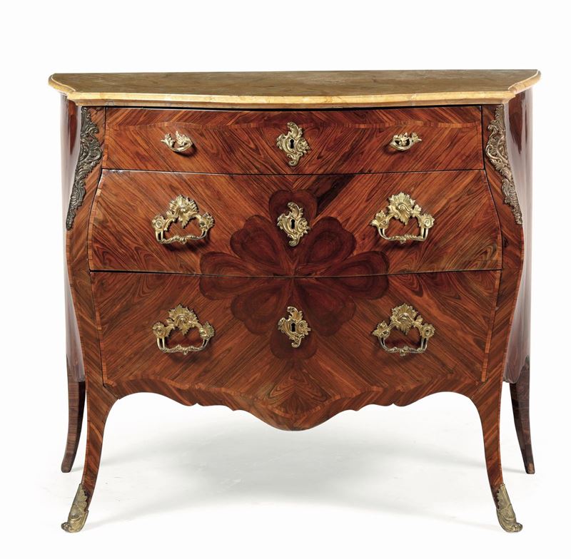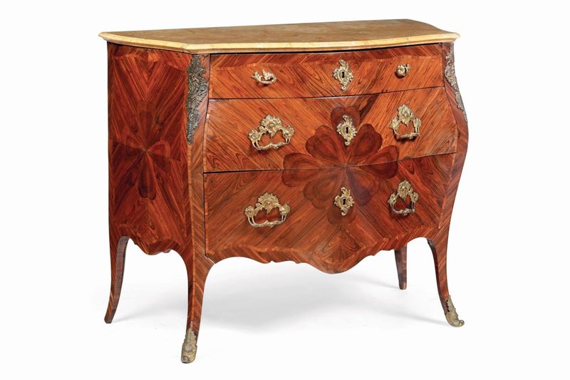 Comò Luigi XV lastronato in palissandro ed intarsiato in bois de rose con il motivo del quadrifoglio. Genova, XVIII secol [..]