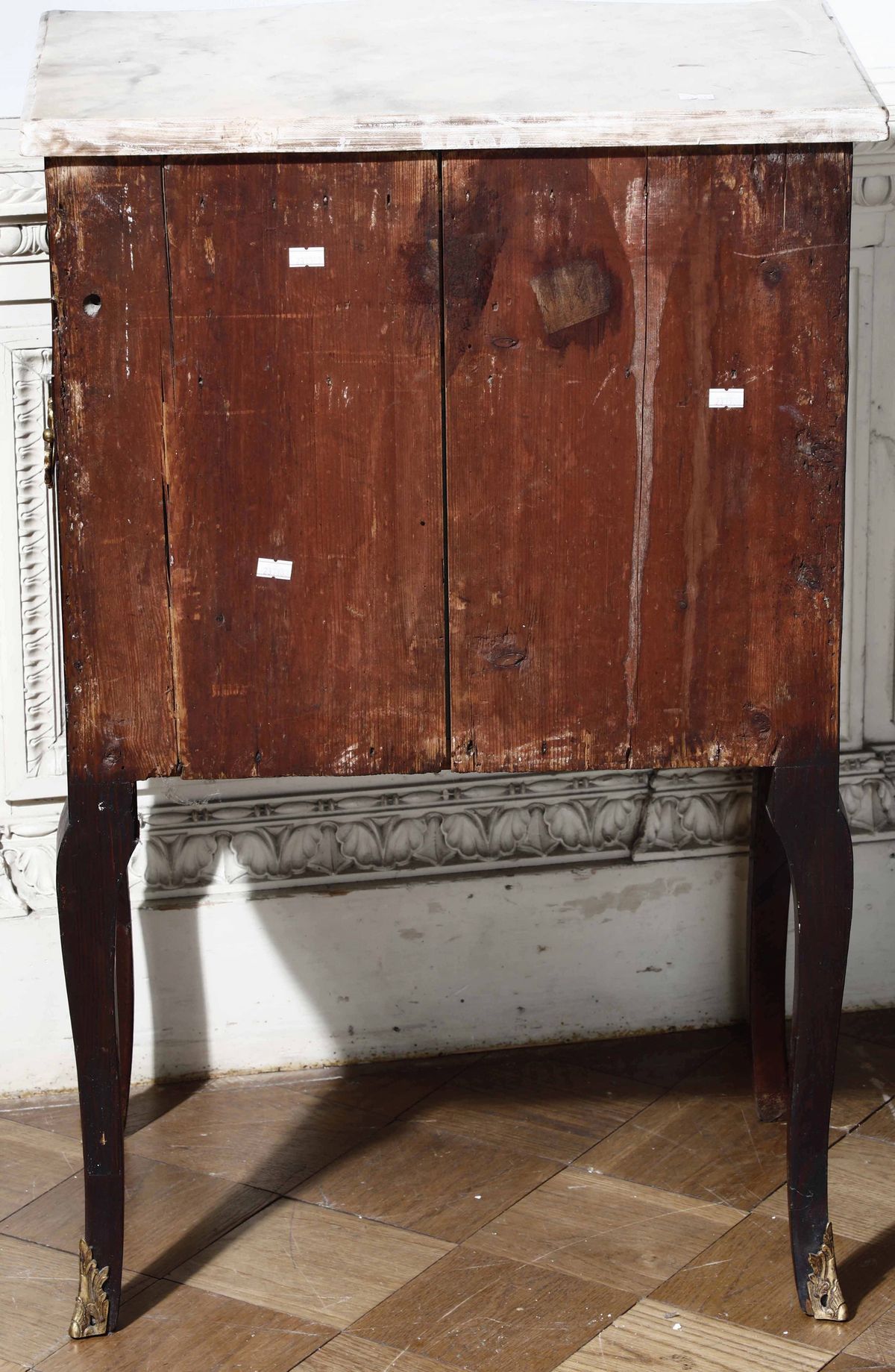 Fronte mosso ad un cassetto e due ante, applicazioni e scarpette in bronzo dorato, piano in marmo