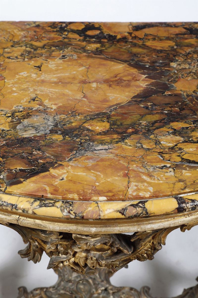 montanti intagliati a volute, elementi fogliacei e mascheroni,piano sagomato in marmo giallo