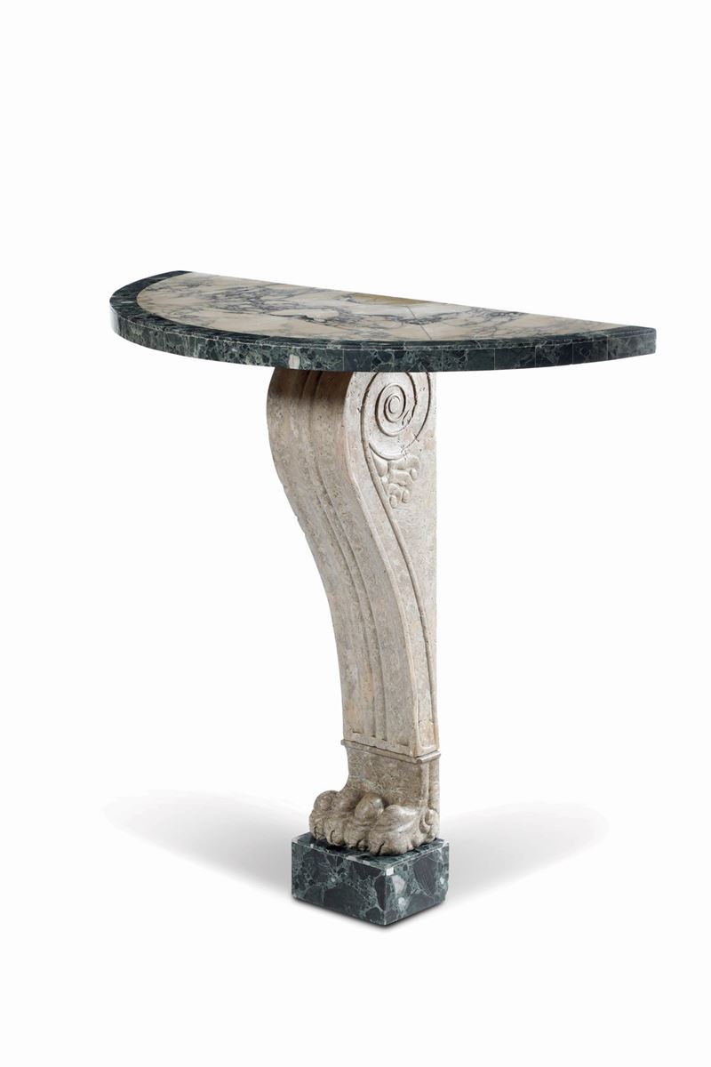 sostegni a mensola con piedi di leoni, piani a mezzaluna lastronati in marmi policromi.