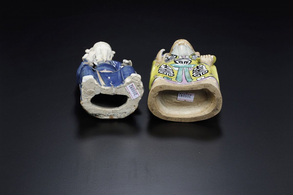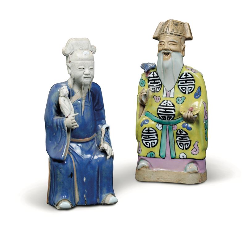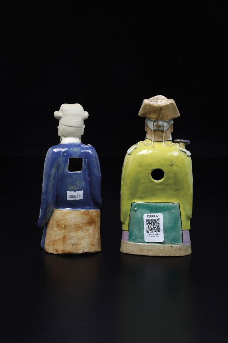 Due figure di dignitari in gres a smalti policromi, Cina, Dinastia Qing, epoca Qianlong (1736-1796)
