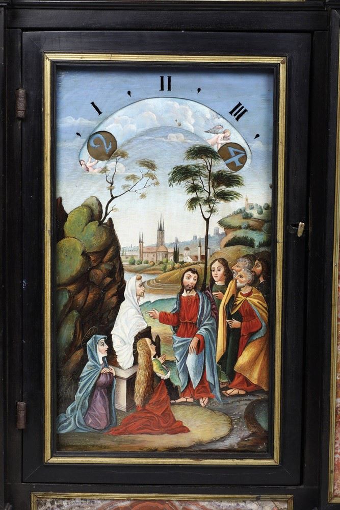 Quadrante non coevo in rame dipinto rappresentante un paesaggio con la resurrezione di Lazzaro.