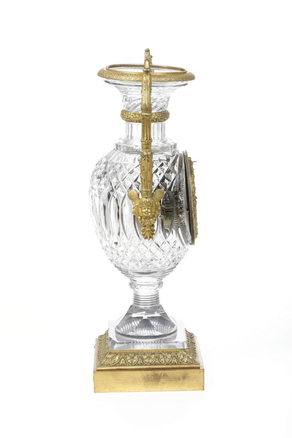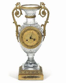 Orologio a vaso con cassa in cristallo e bronzo dorato. XIX secolo