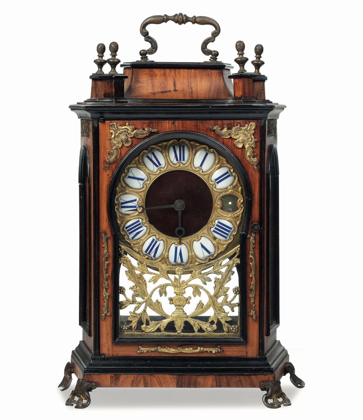 cassa in legno con profili in legno ebanizzato, quadrante a cartouches in numeri romani