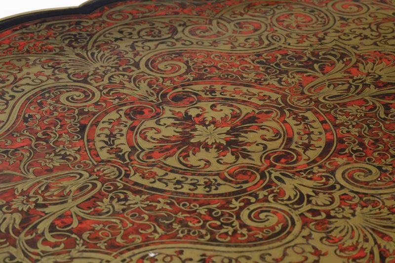 Tavolo in legno ebanizzato e decoro in bronzo e metallo dorato stile Boulle, Francia XIX secolo