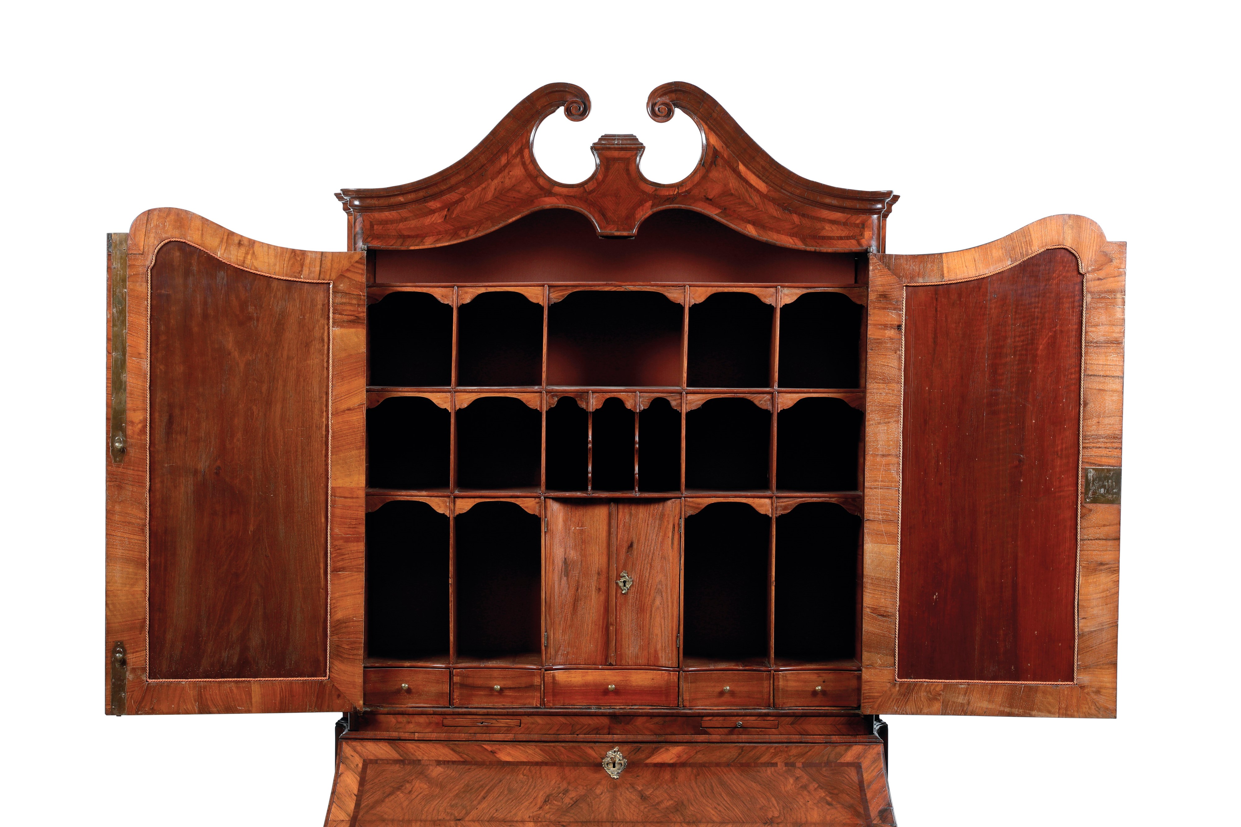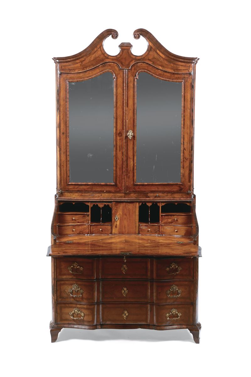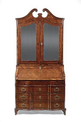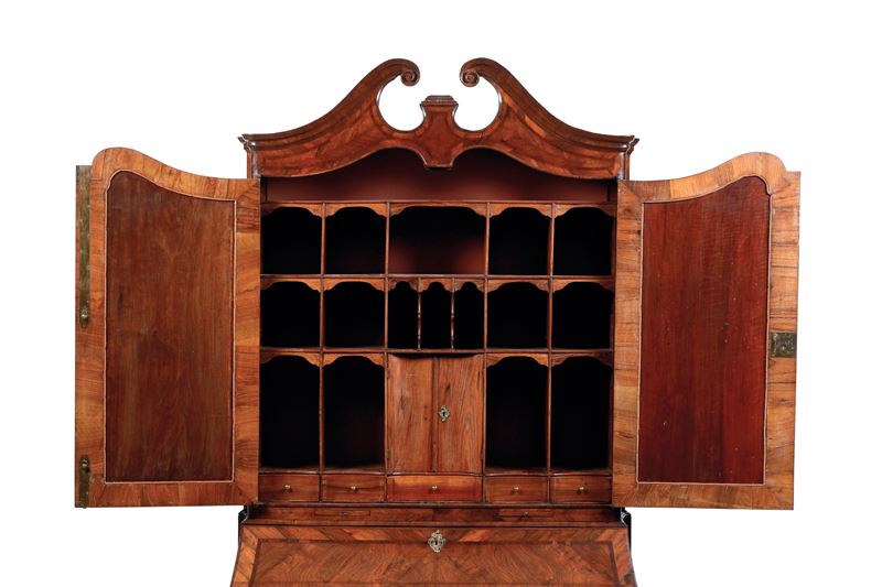 fronte mosso a quattro cassetti, due ante a vetri nella parte superiore e cimasa a timpano spezzato, interni in conifera