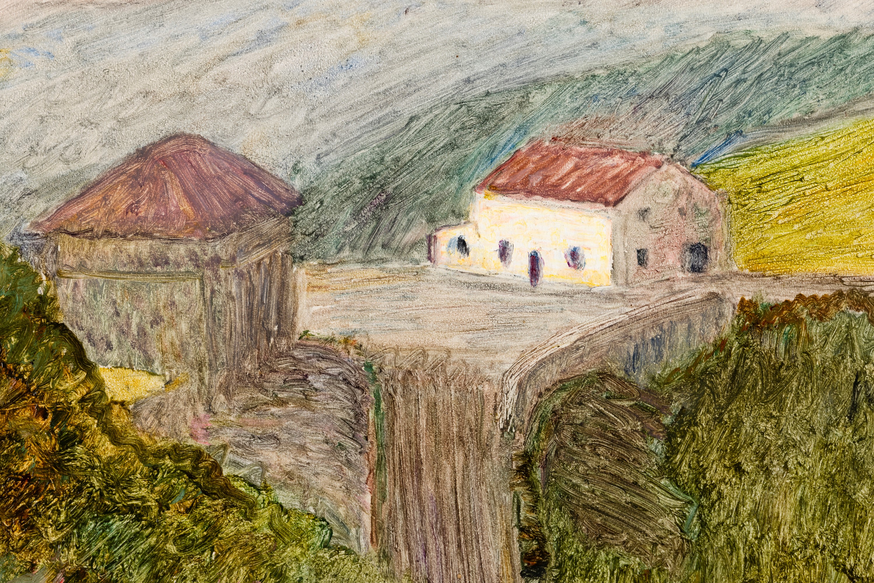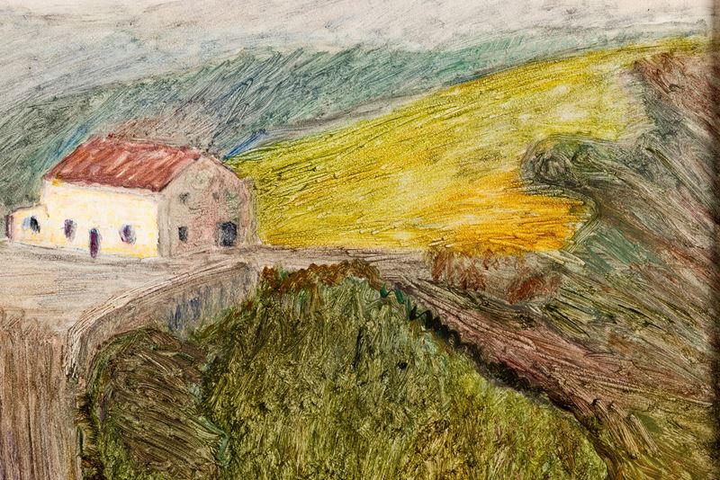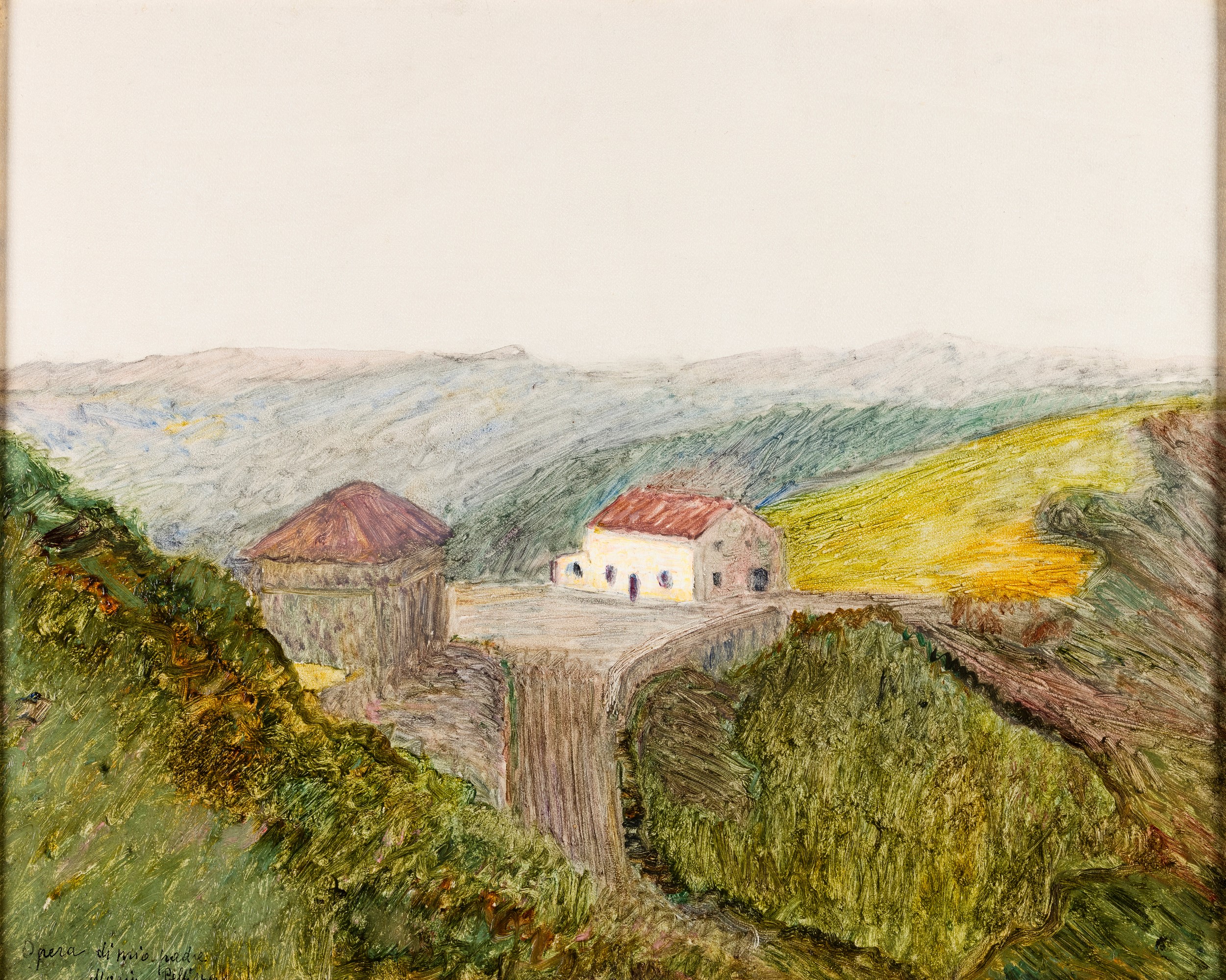 "Il bozzetto riproduce il passo del Penice inquadrando il ricovero n. 2 entro la cornice delle alture circostanti, facendolo diventare con il suo volume chiaro il punto di riferimento della stesura cromatica