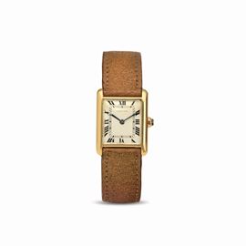 Elegante Tank Louis in oro giallo 18 kt a carica manuale, quadrante con numeri Romani, minuteria Chemin de Fer e deployante [..]