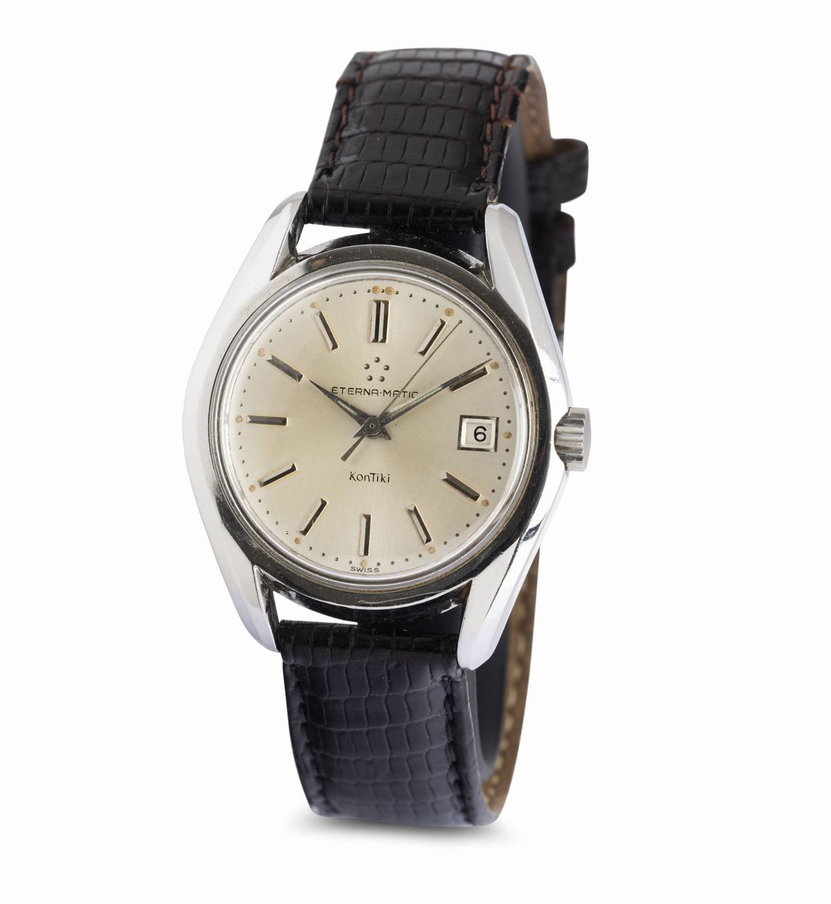 Kontiki impermeabile cassa in acciaio con fondello a vite, quadrante argentè con indici applicati e indicazione della dat [..]