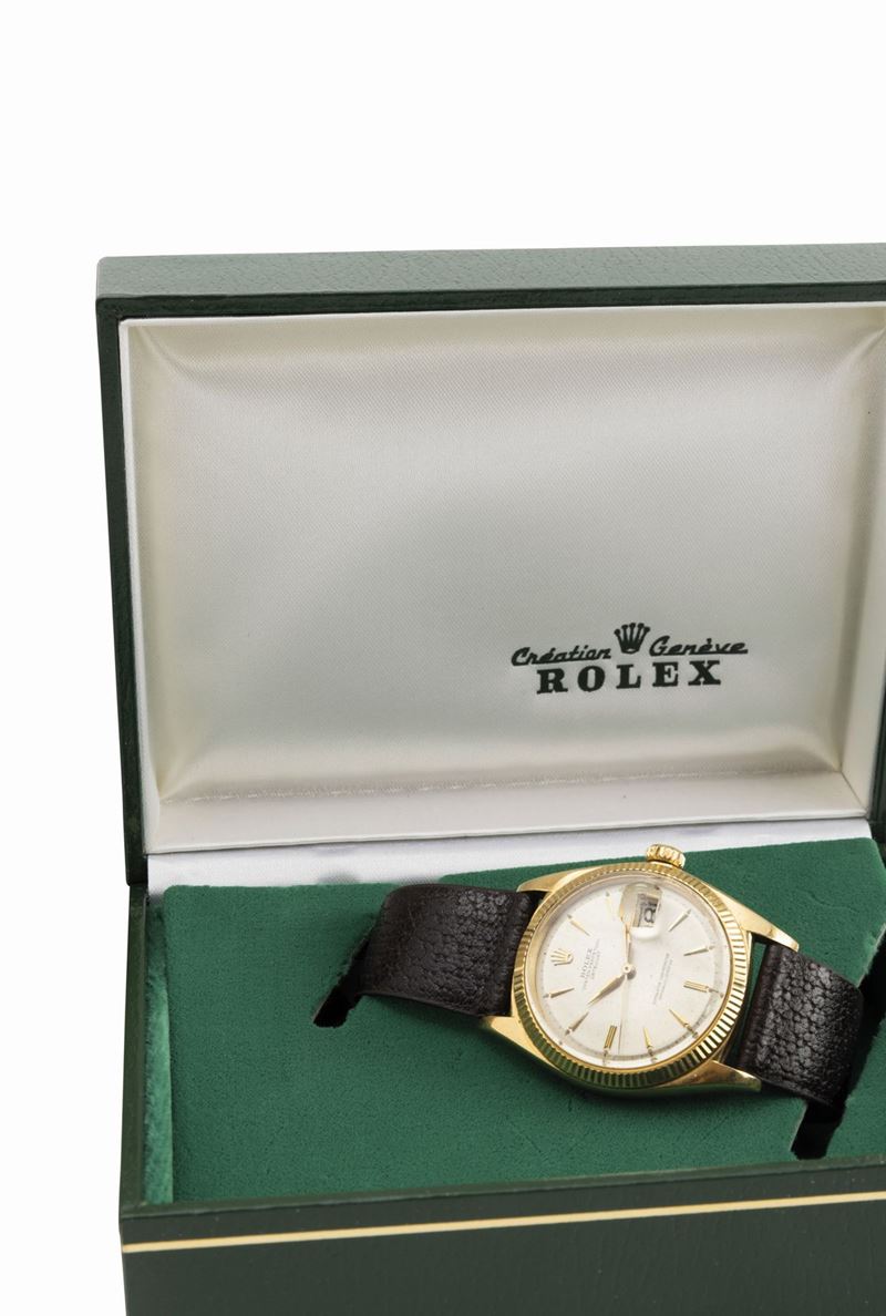 Classico Datejust 1601 in oro giallo 18k, quadrante Argentè, lancette ed indici a foglia con scatola, garanzia e certificato di cronometria