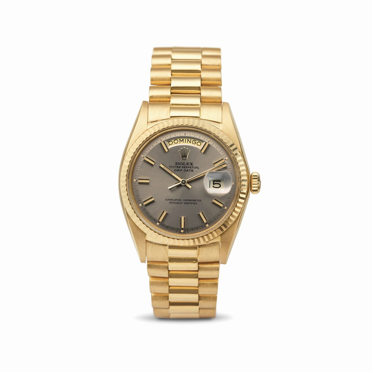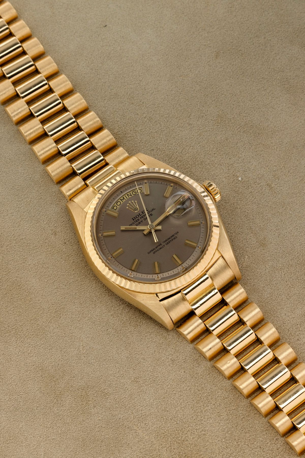 Classico ed elegante Daydate 1803, in oro giallo 18k con particolare quadrante color visone ed indici "Wide Boy", bracciale President con chiusura a scomparsa