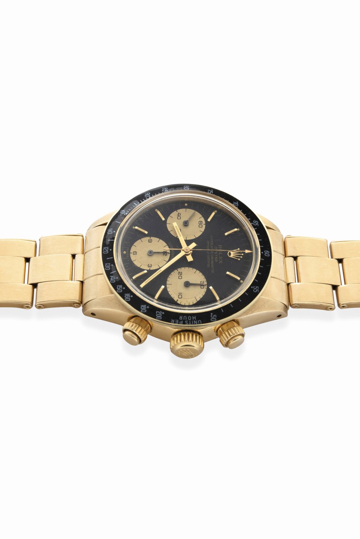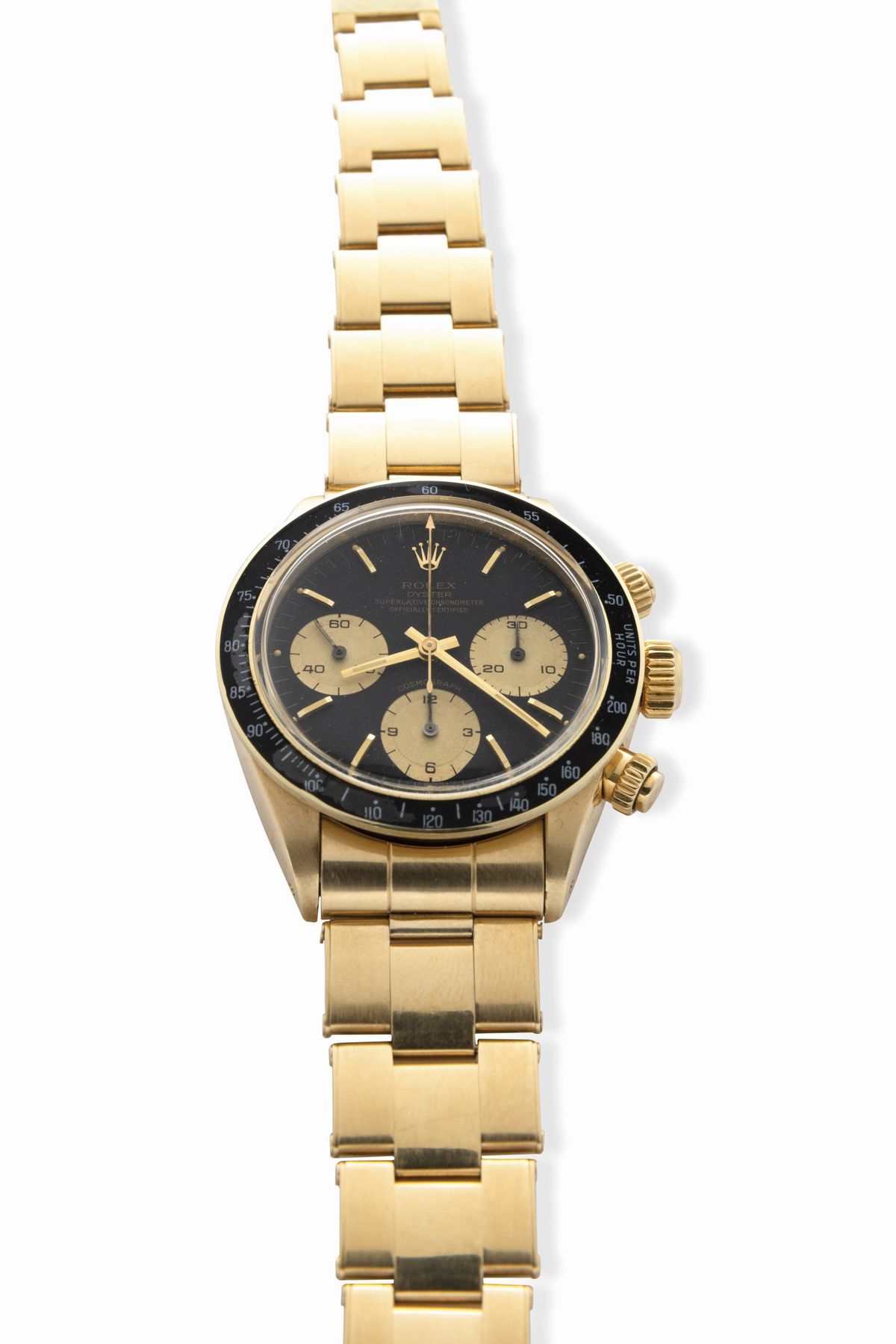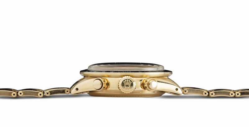 Eccezionale Cosmograph Daytona ref 6263 in oro giallo 18k, quadrante nero contatori champagne, ghiera nera acrilica, bracciale [..]