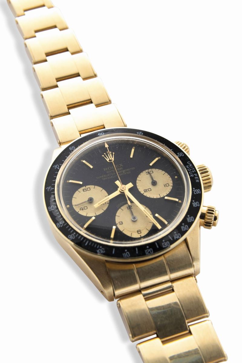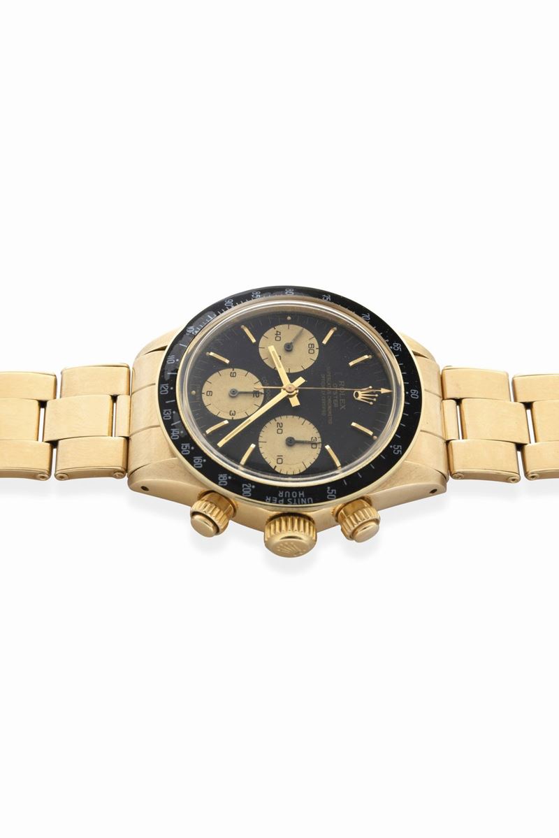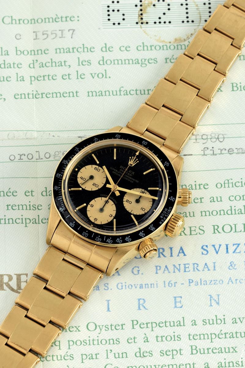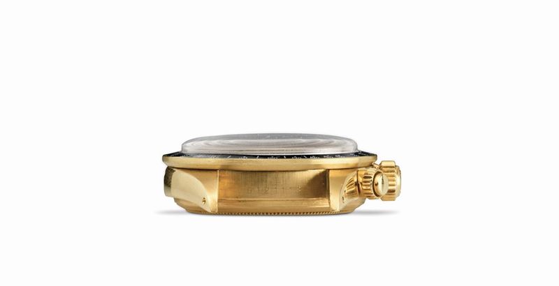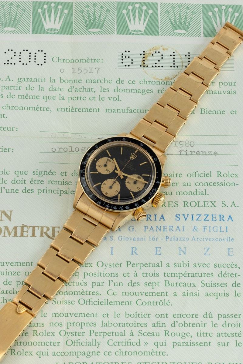 Introdotta alla fine degli anni ’70 e rimasta in produzione fino al 1987, la referenza 6263 (insieme alla referenza 6265), è stata prevalentemente realizzata in acciaio. Il presente orologio fa parte invece della più limitata produzione di casse in oro 18k, in questo caso si stima essere inferiore ai 2000 esemplari. La caratteristica fondamentale di questi orologi, oltre all’utilizzo del metallo più pregiato, è la presenza della scritta: “Superlative Chronometer Officially Certified” sul quadrante, che specifica appunto la certificazione cronometrica. La configurazione di questo quadrante nero con registri champagne a contrasto insieme alla lunetta nera acrilica è un connubio di eleganza e sportività. L’orologio è complessivamente in ottimo stato conservativo ed è accompagnato da garanzia originale, la quale ci conferma che è stato venduto in Italia nel 1979.