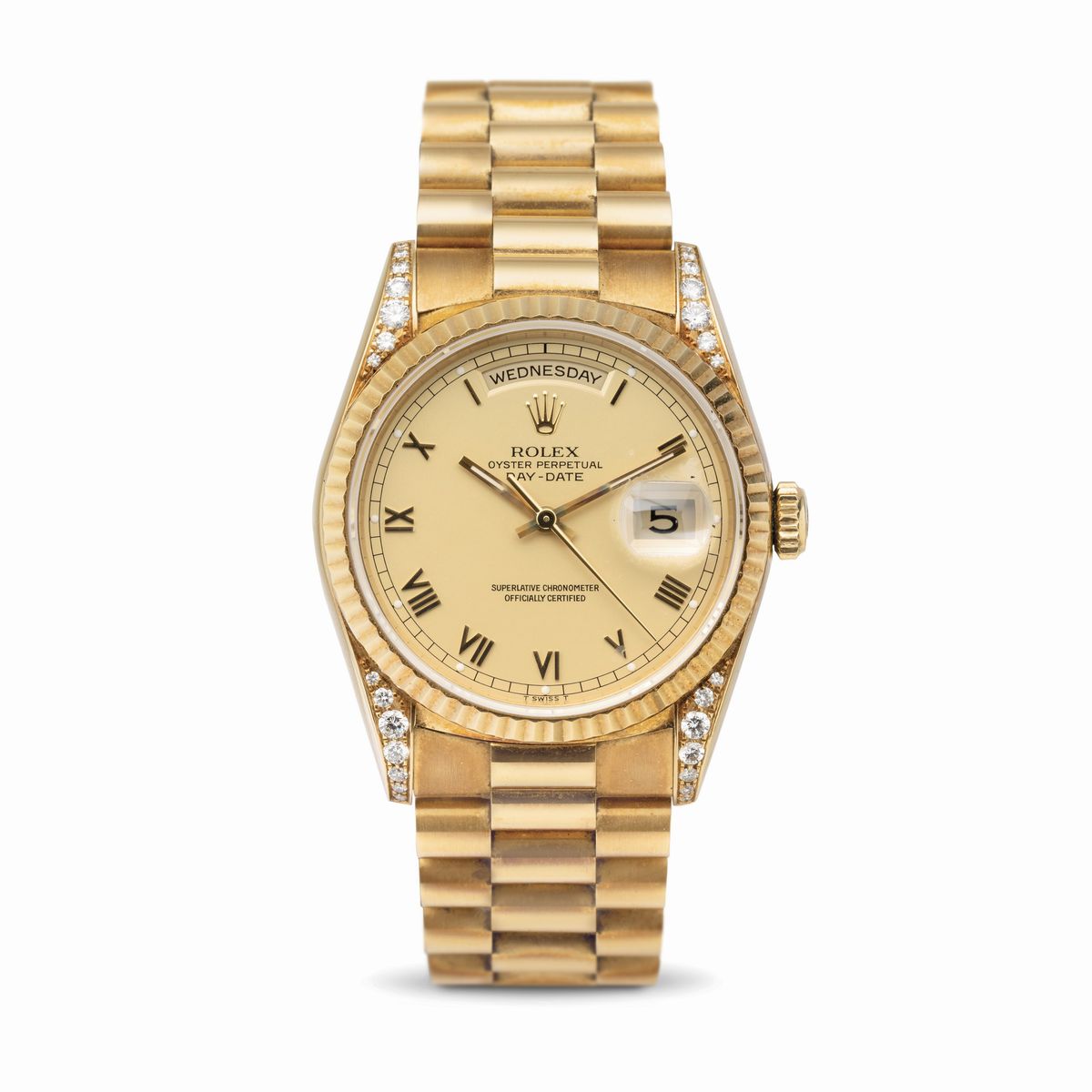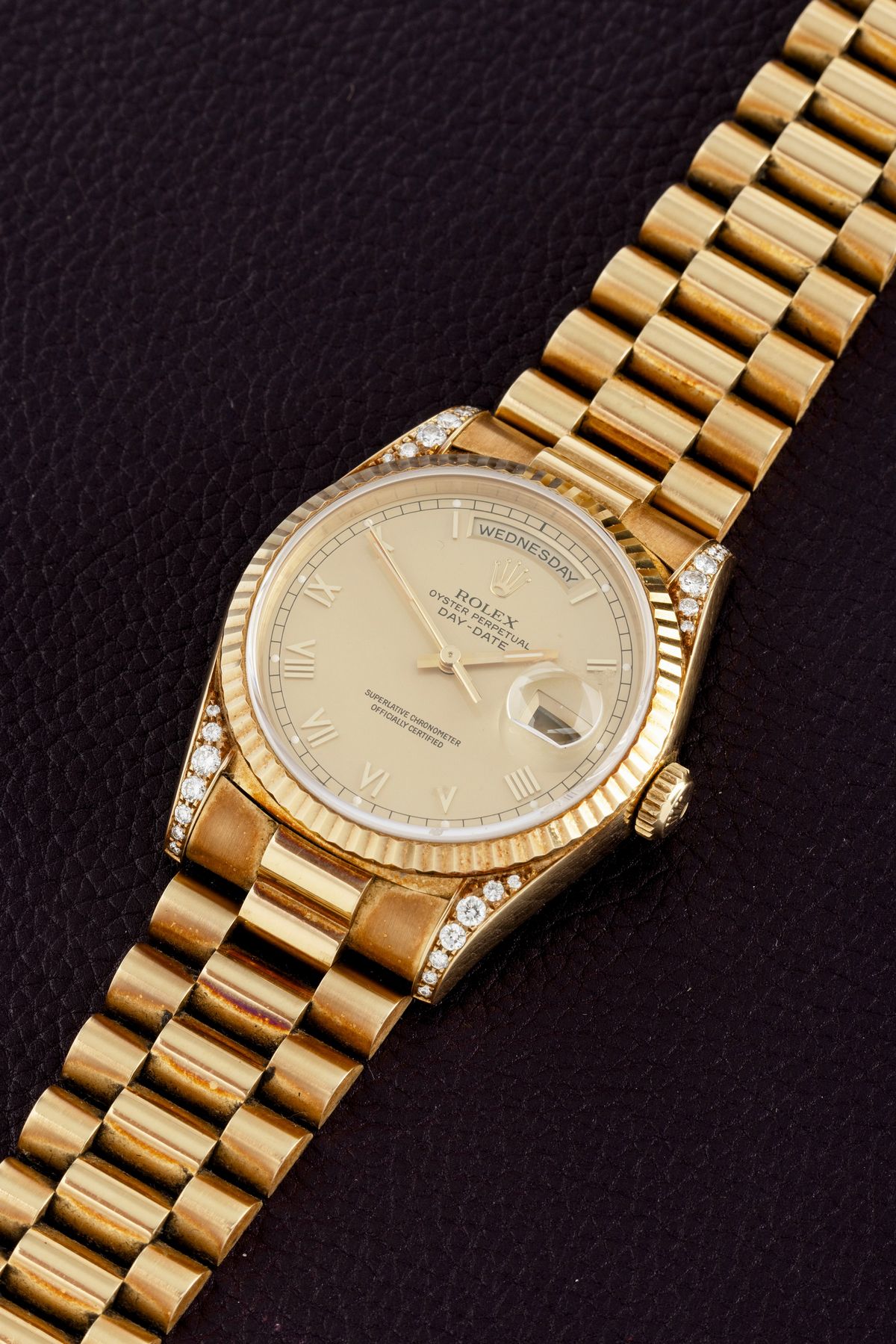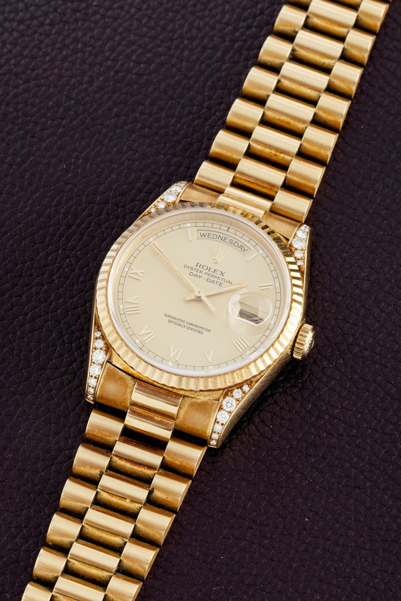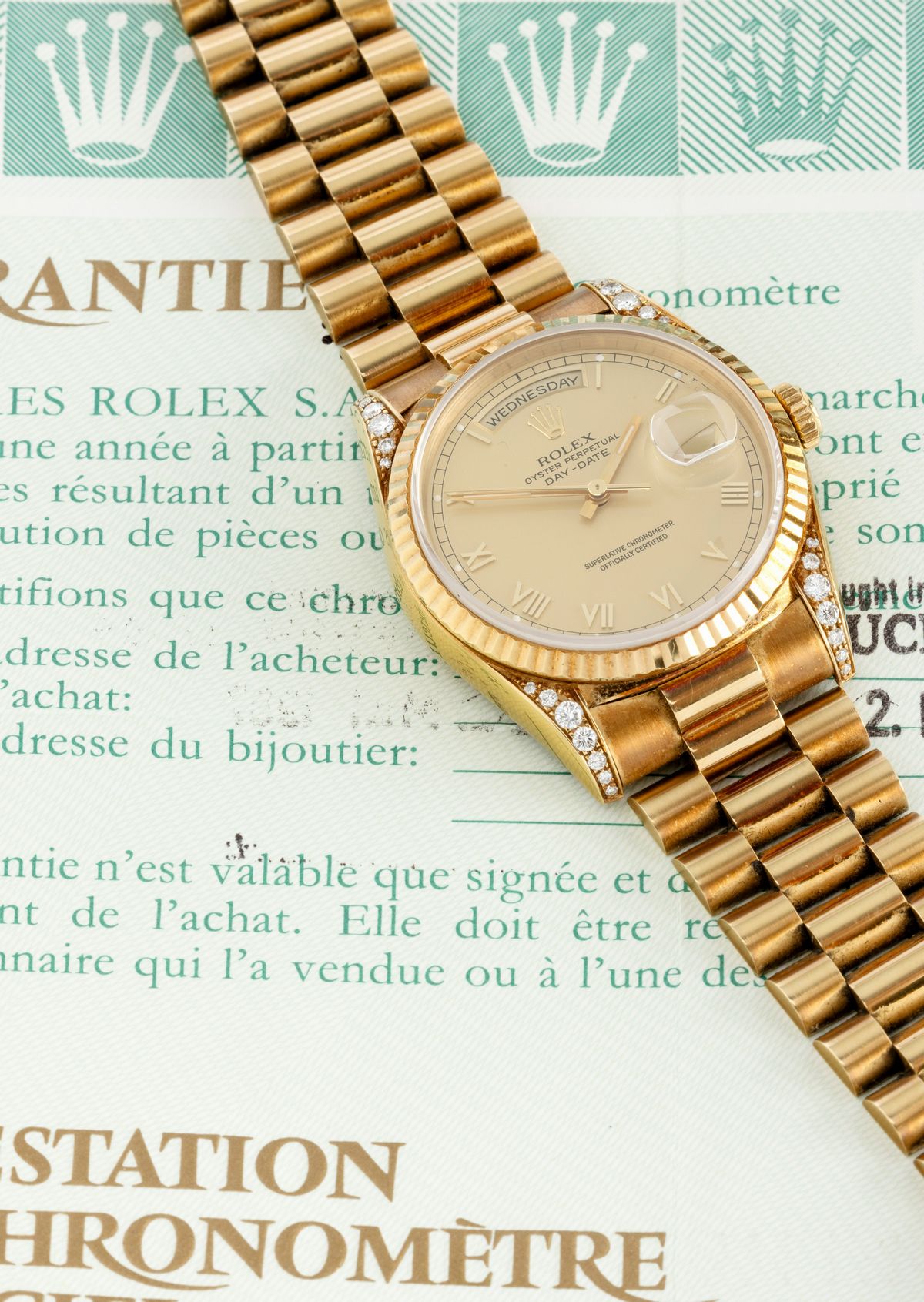 Raro e prezioso Daydate ref 18338 in oro giallo 18k con diamanti incastonati sulle anse, quadrante champagne opaco con numeri Romani applicati corredato di garanzia originale